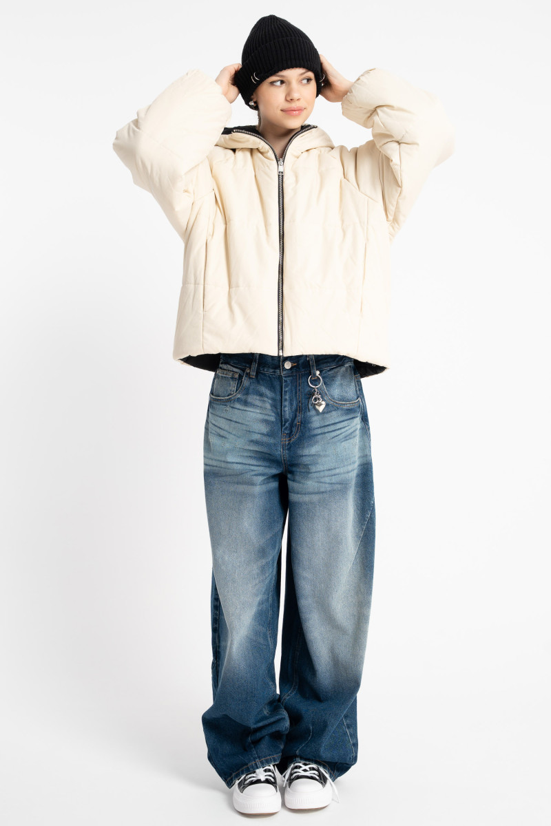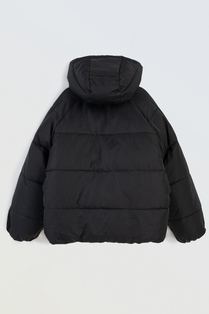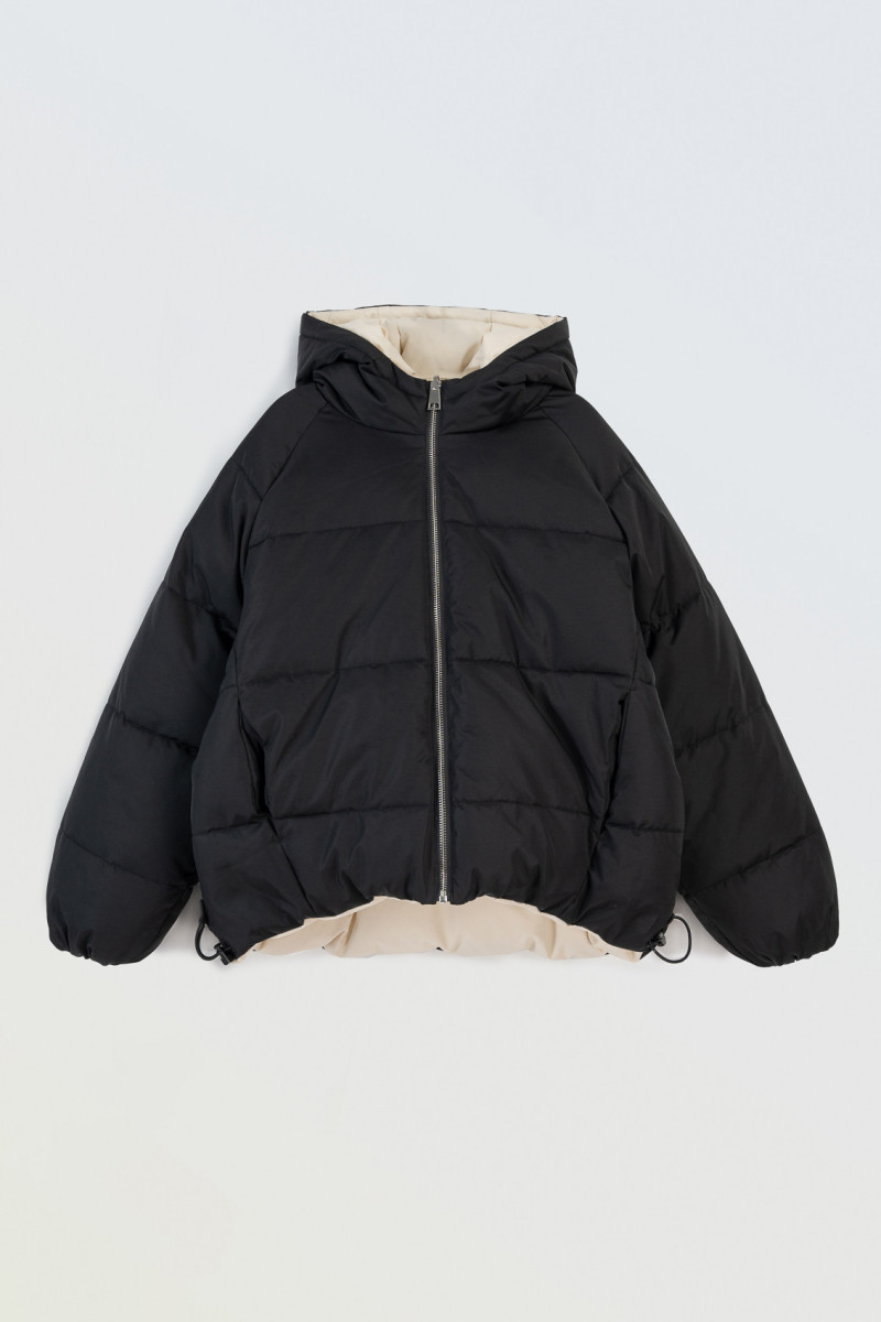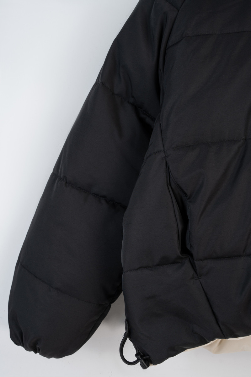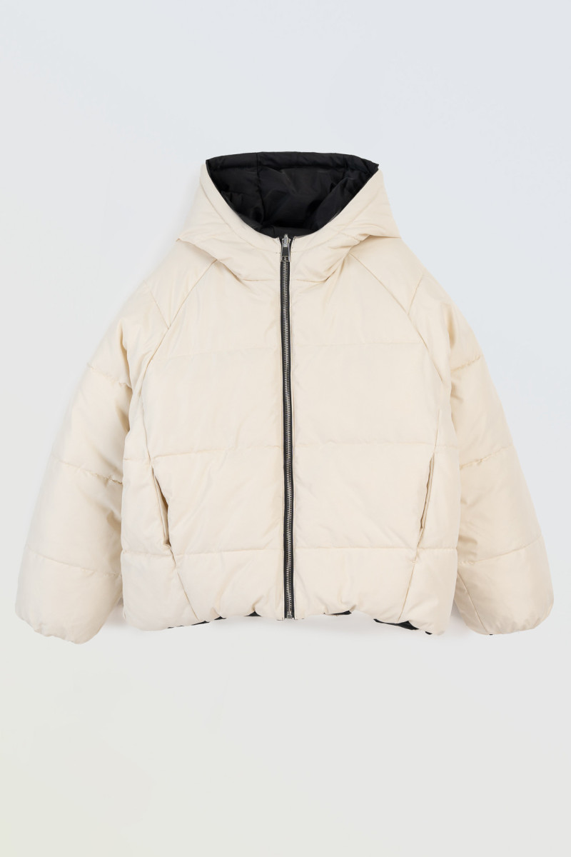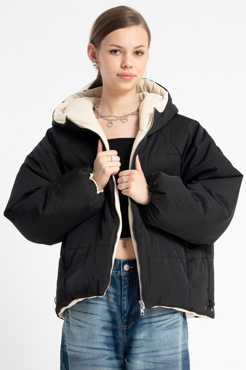 Καπιτονέ μπουφάν διπλής όψης, μία όψη σε μαύρη και η άλλη σε κρεμ απόχρωση. Διαθέτει,