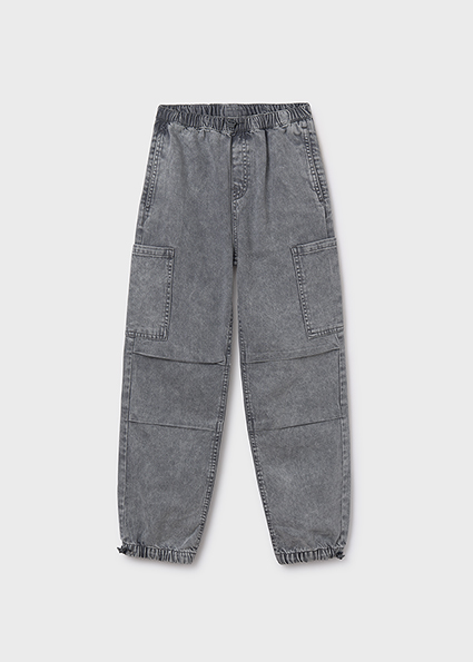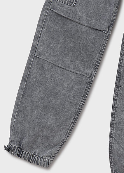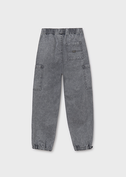 Cargo τζιν σε μαύρη απόχρωση με λάστιχο στη μέση και το τελείωμα. Τσέπες στο πλάι, μπροστά και πίσω.