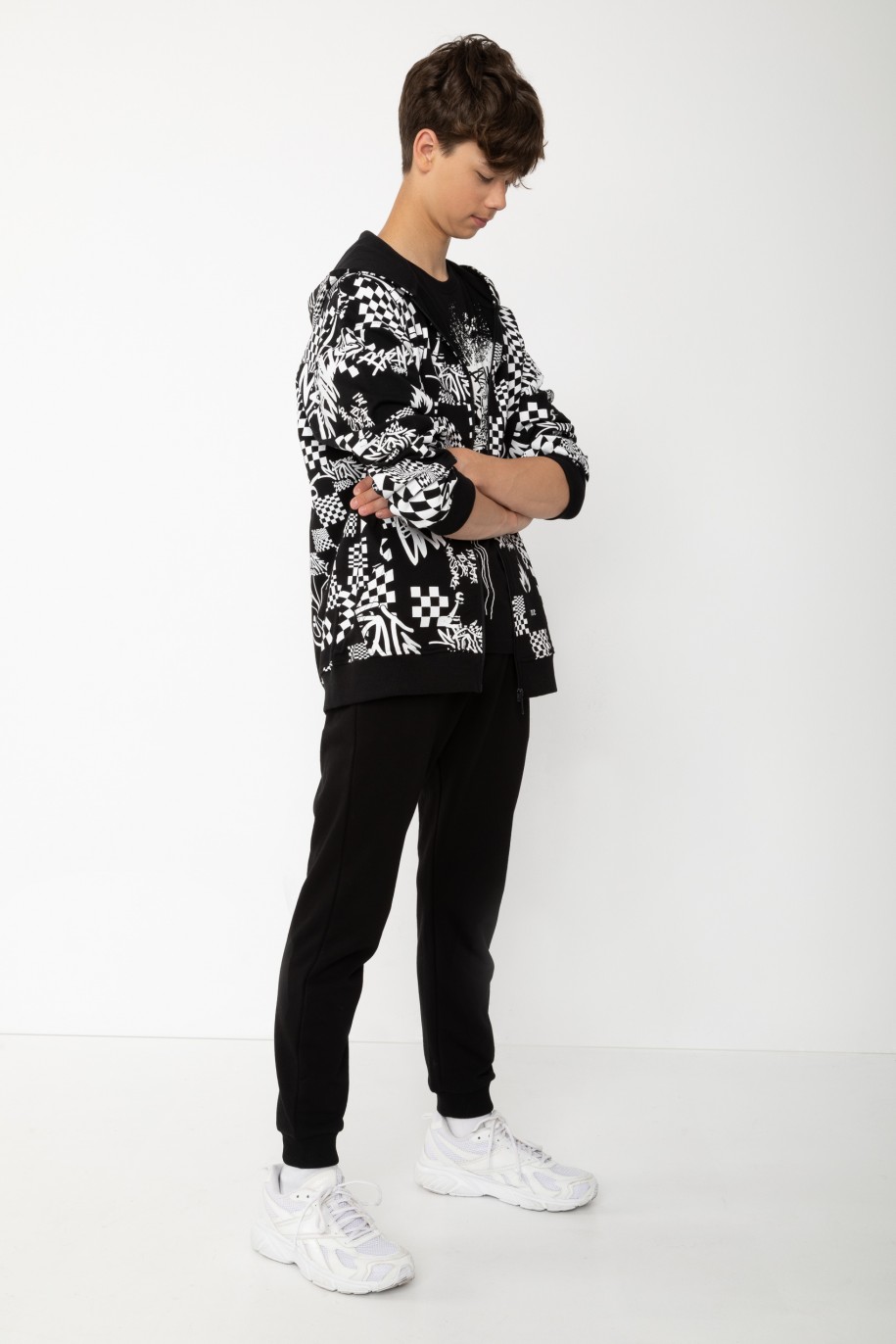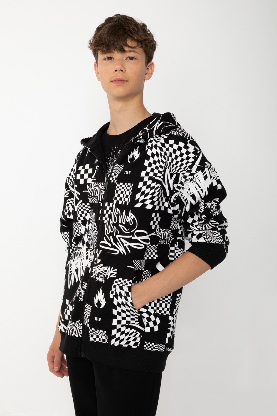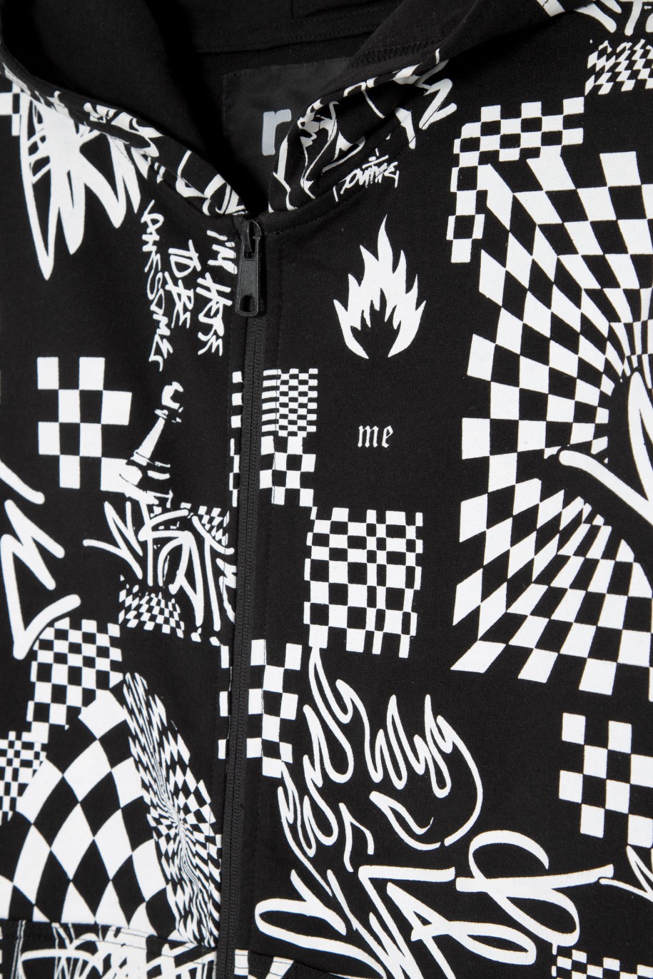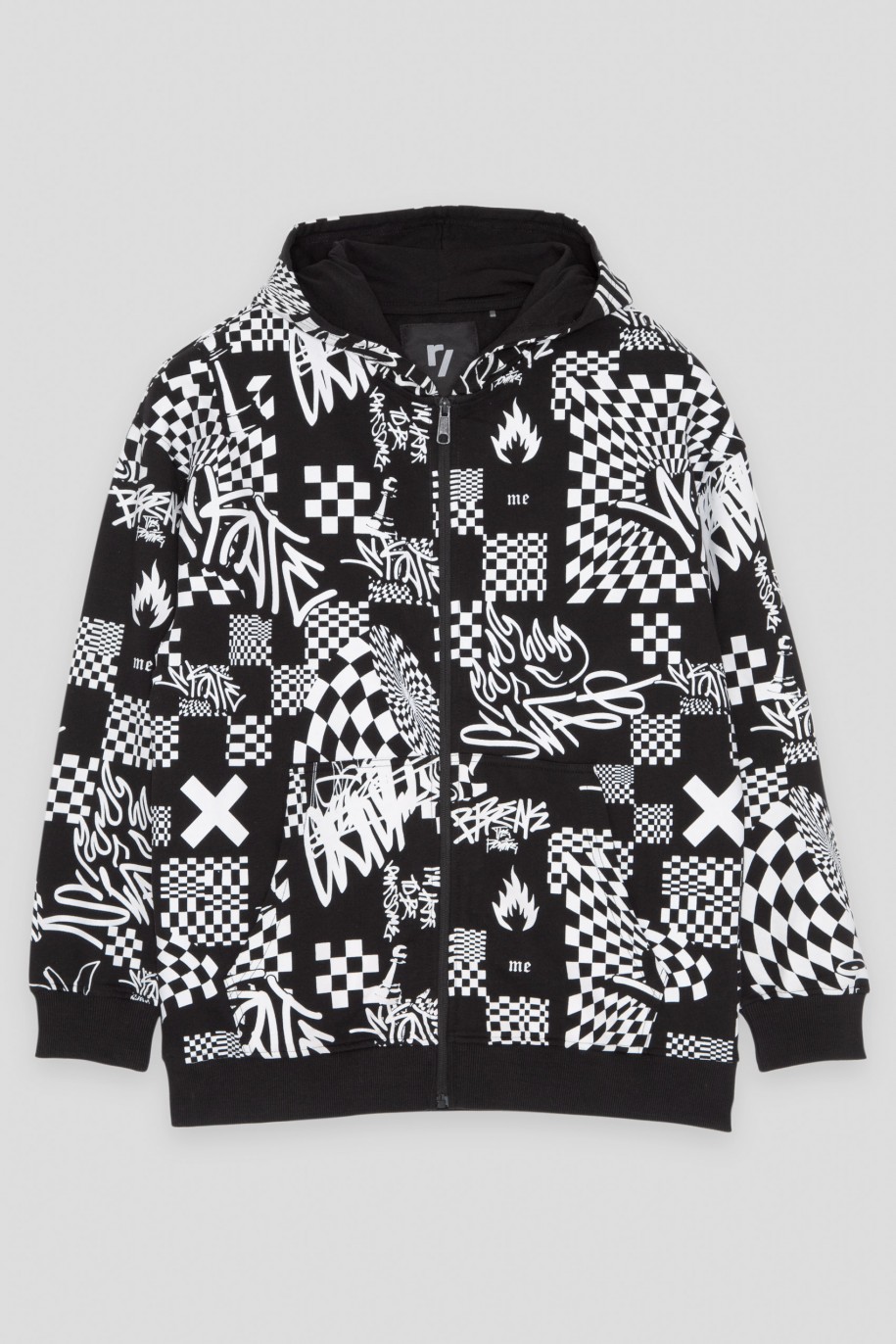 Βαμβακερή ζακέτα με κουκούλα σε μαύρο χρώμα με άσπρο τύπωμα. Κλείνει με φερμουάρ και διαθέτει δύο τσέπες.