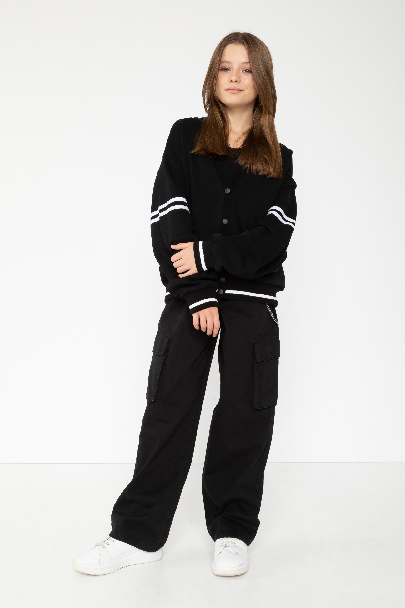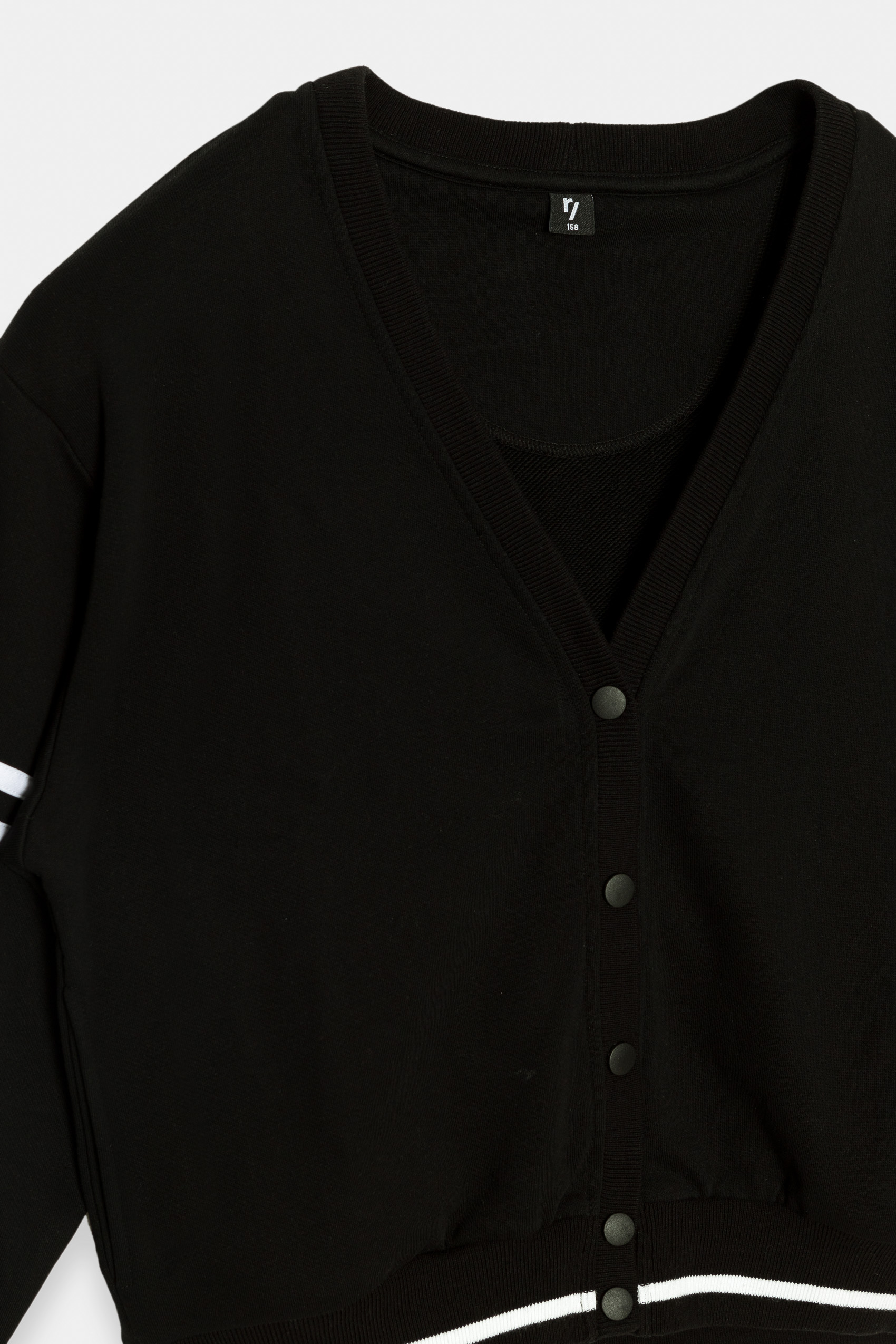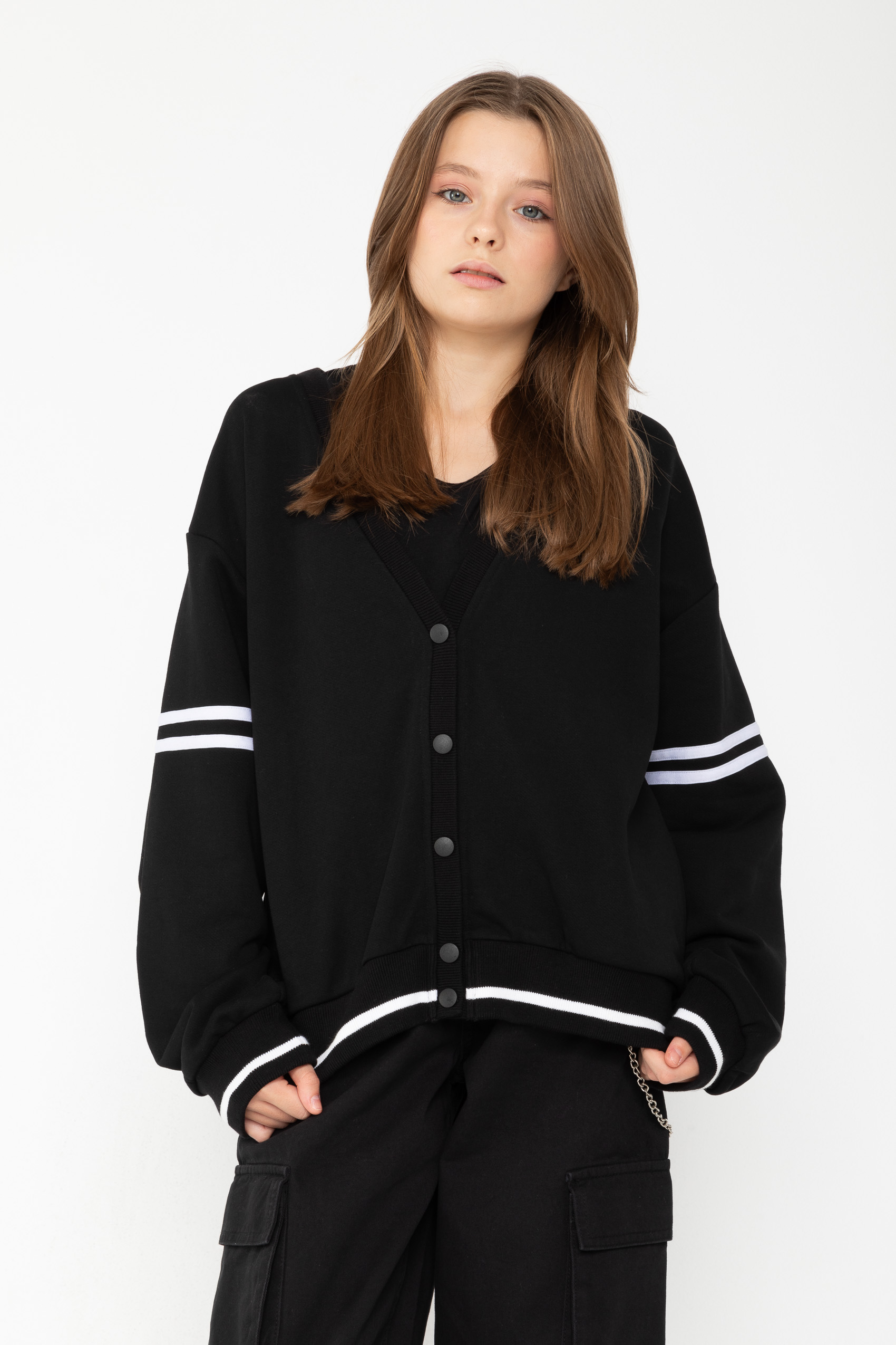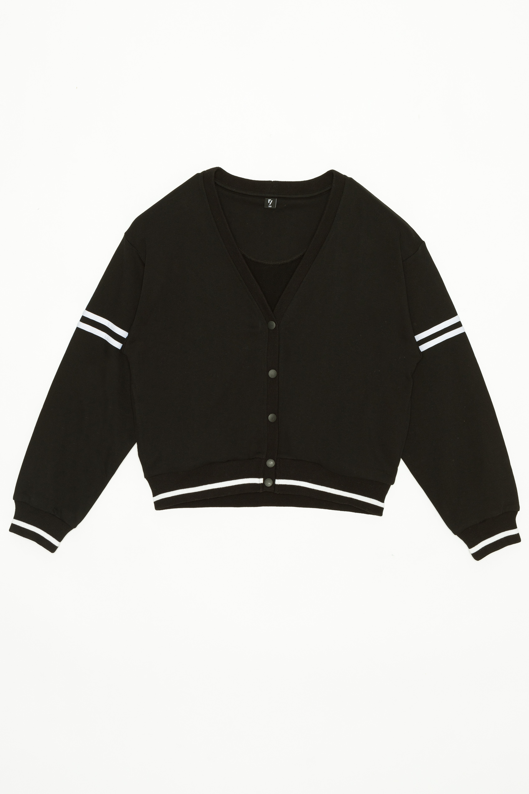 Μαύρη ζακέτα college style με loose εφαρμογή. Λάστιχο στο τελείωμα και στα μανίκια με άσπρη ρίγα. Η ζακέτα κλείνει με κουμπιά.