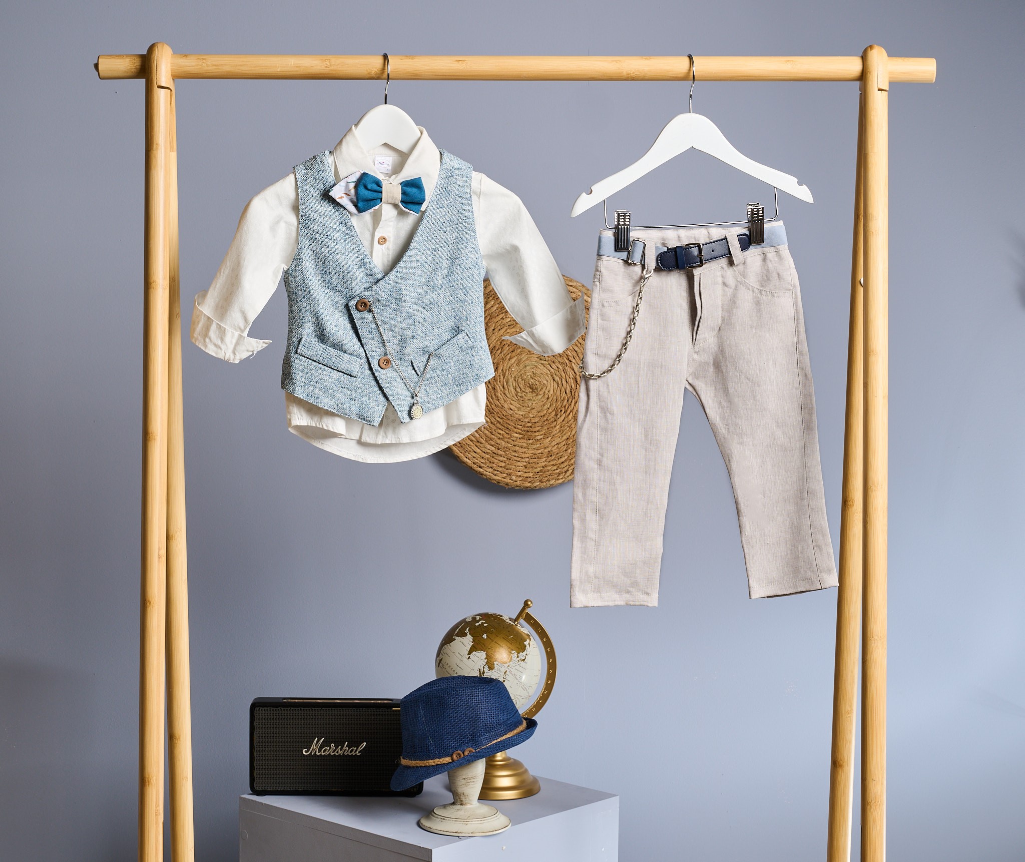 Το σύνολο ολοκληρώνεται με στολισμένο μπλε καπέλο και υφασμάτινο παπιγιόν με δύο όψεις.
