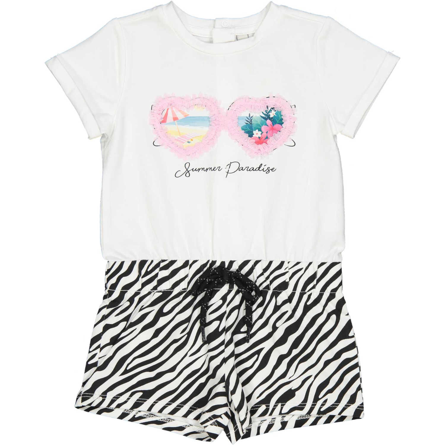 Ολόσωμο σορτς το οποίο στο πάνω μέρος είναι λευκό με σχέδιο ροζ γυαλιά και μαύρο λογότυπο Summer paradise, και στο κάτω μέρος είναι ασπρόμαυρο με ζέβρα πριντ. Έχει λάστιχο στη μέση και ασπρόμαυρο κορδόνι.