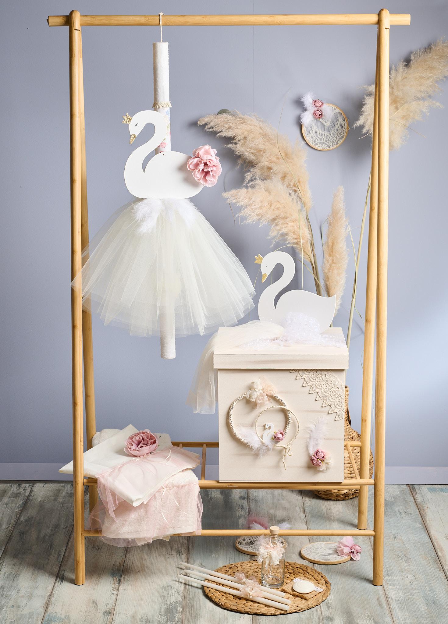 Ghic, εντυπωσιακό πακέτο βάπτισης με κύκνο λουλούδια πέρλες.