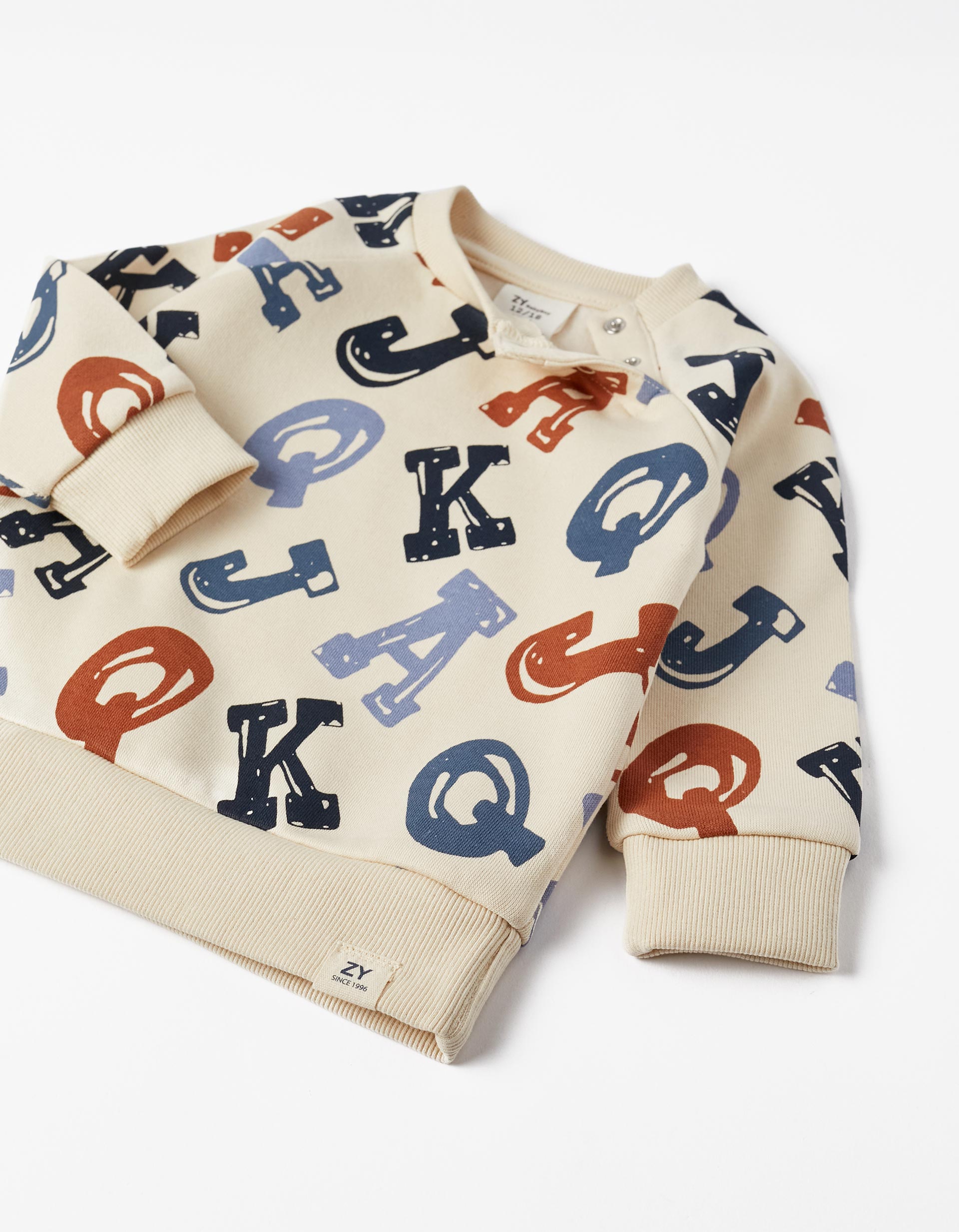 Αποτελείται από μπλουζάκι φούτερ σε μπεζ χρώμα all over με γράμματα σε καφέ κ μπλε αποχρώσεις