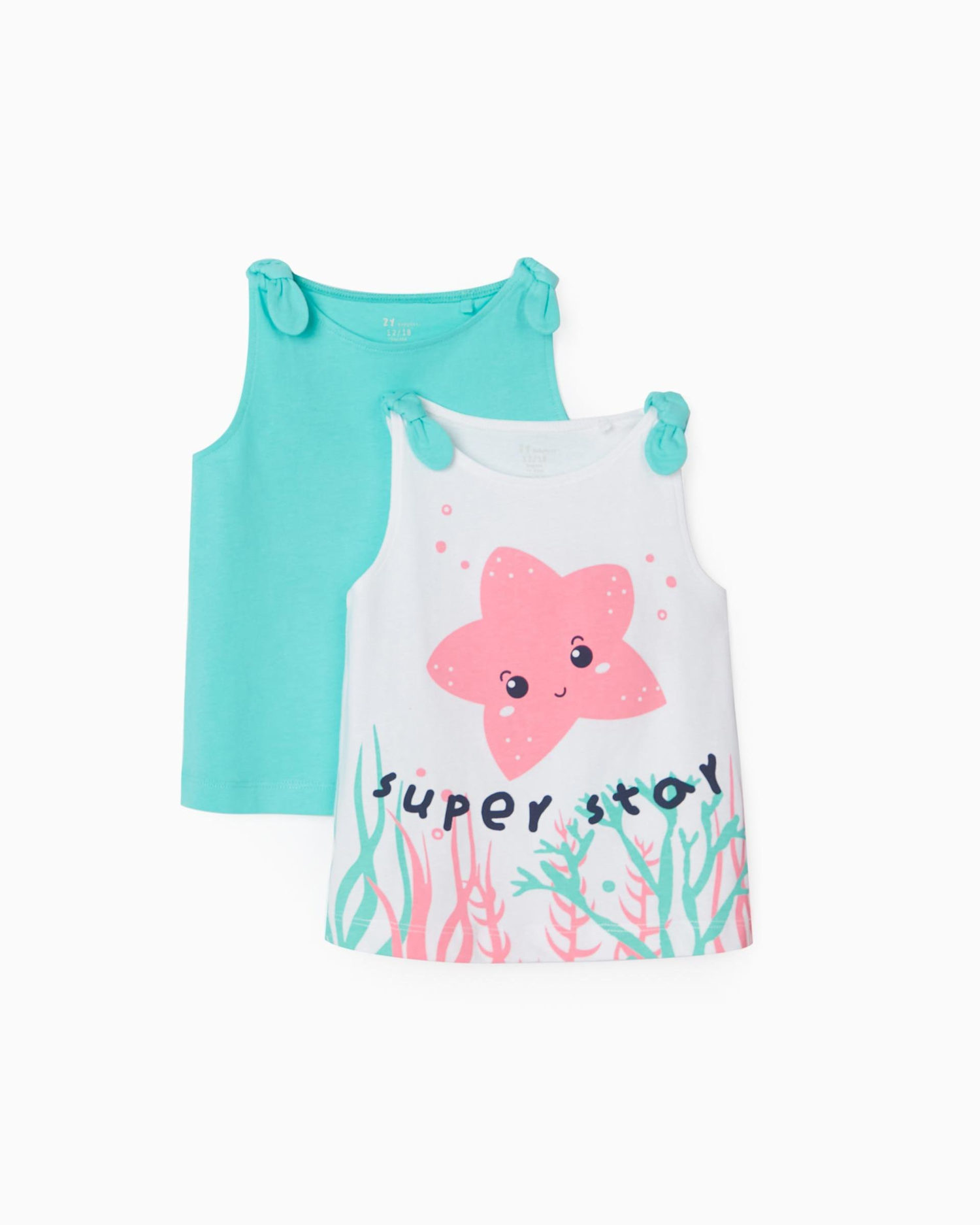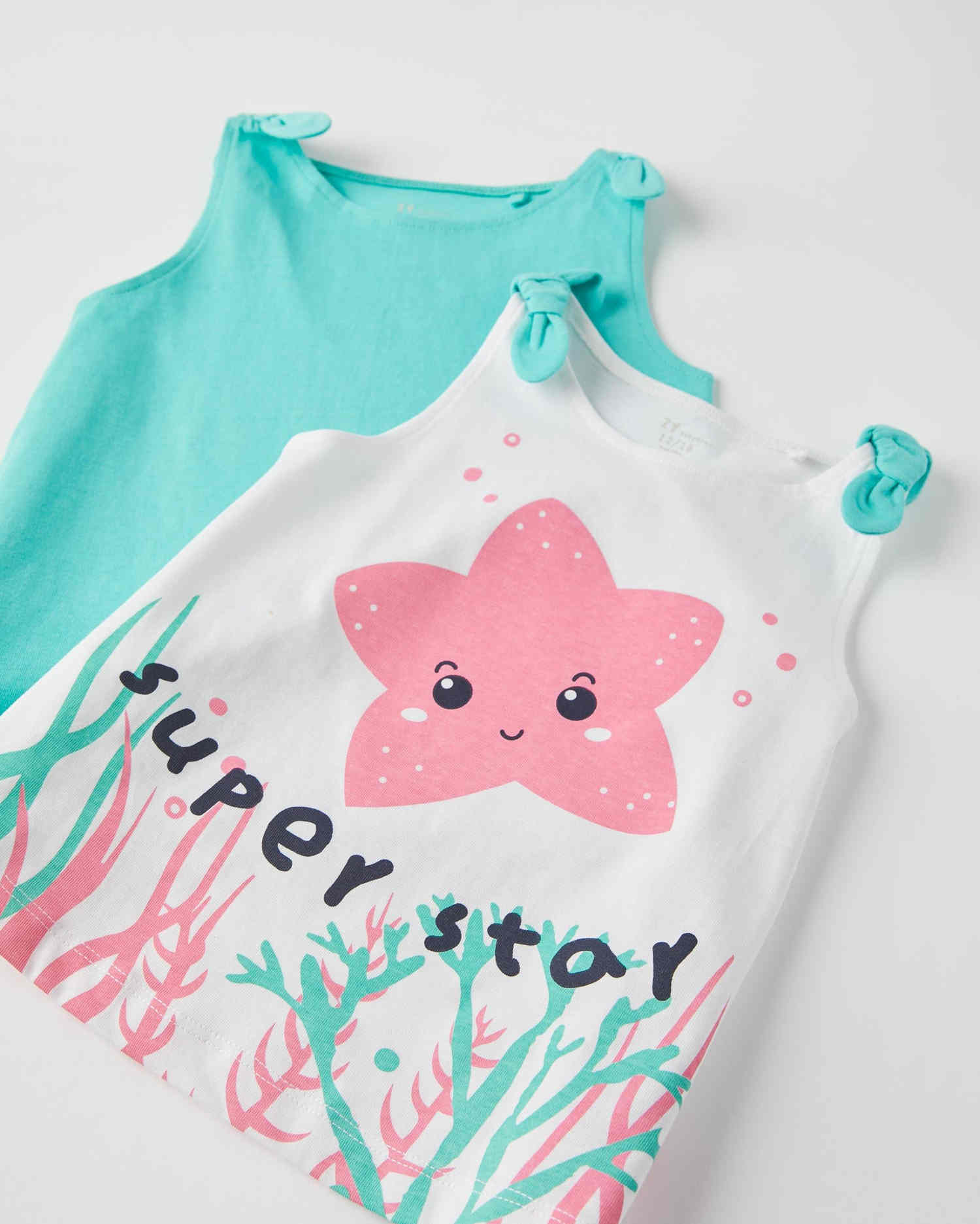 Σετ δύο αμάνικες μπλούζες. Δύο χρώματα, η μία είναι λευκή με μοτίβο μπροστά και η άλλη μονόχρωμη στο χρώμα της μέντας. Τιράντες με δέσιμο που κολακεύει τους ώμους.