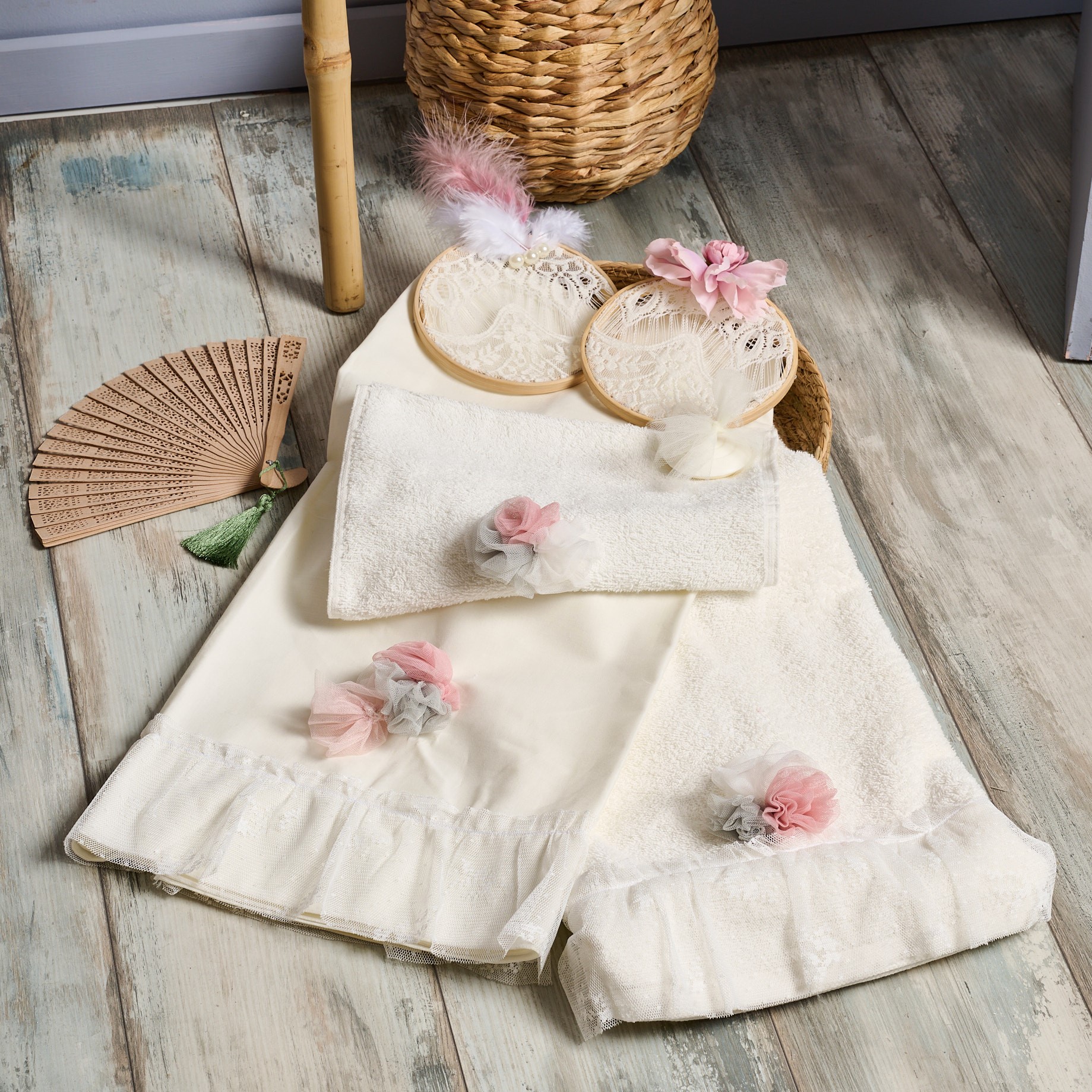 Χαρακτηριστικό το βολάν δαντέλας και μια μπιτουνιέρα που στολίζει την μεγάλη πετσέτα, το σεντόνι και διακριτικά την μικρή πετσέτα.