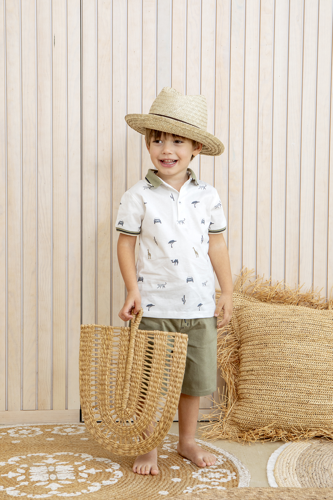 Σετ το οποίο αποτελείται από λευκή polo μπλούζα με γιακά και διάφορα patterns και βερμούδα σε λαδί απόχρωση με λάστιχο στη μέση για εύκολη εφαρμογή.