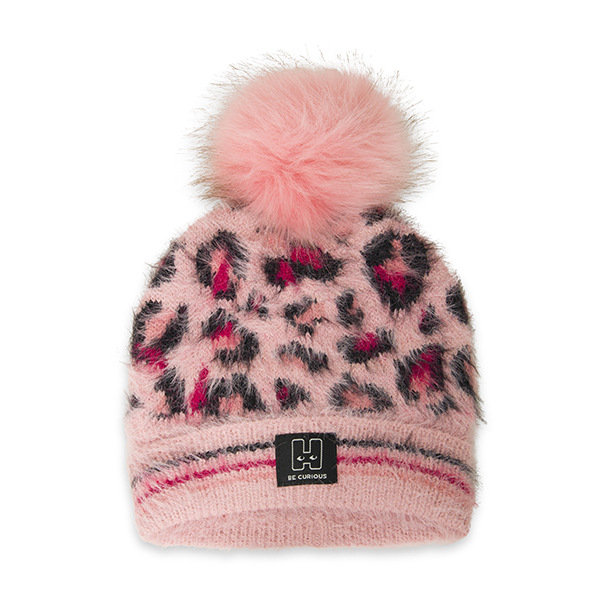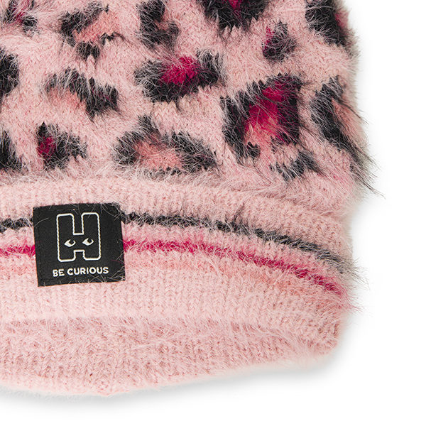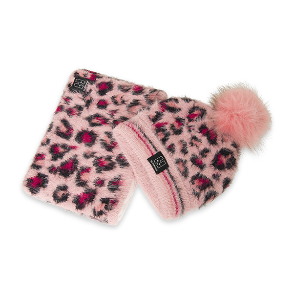 Πλεκτό σετ το οποίο αποτελείται από σκουφάκι με ροζ λεοπάρ μοτίβο και ροζ φούντα και λαιμό με το ίδιο μοτίβο. Φλις ενίσχυση στο εσωτερικό του λαιμού. Ιδιαίτερα μαλακή ύφανση.