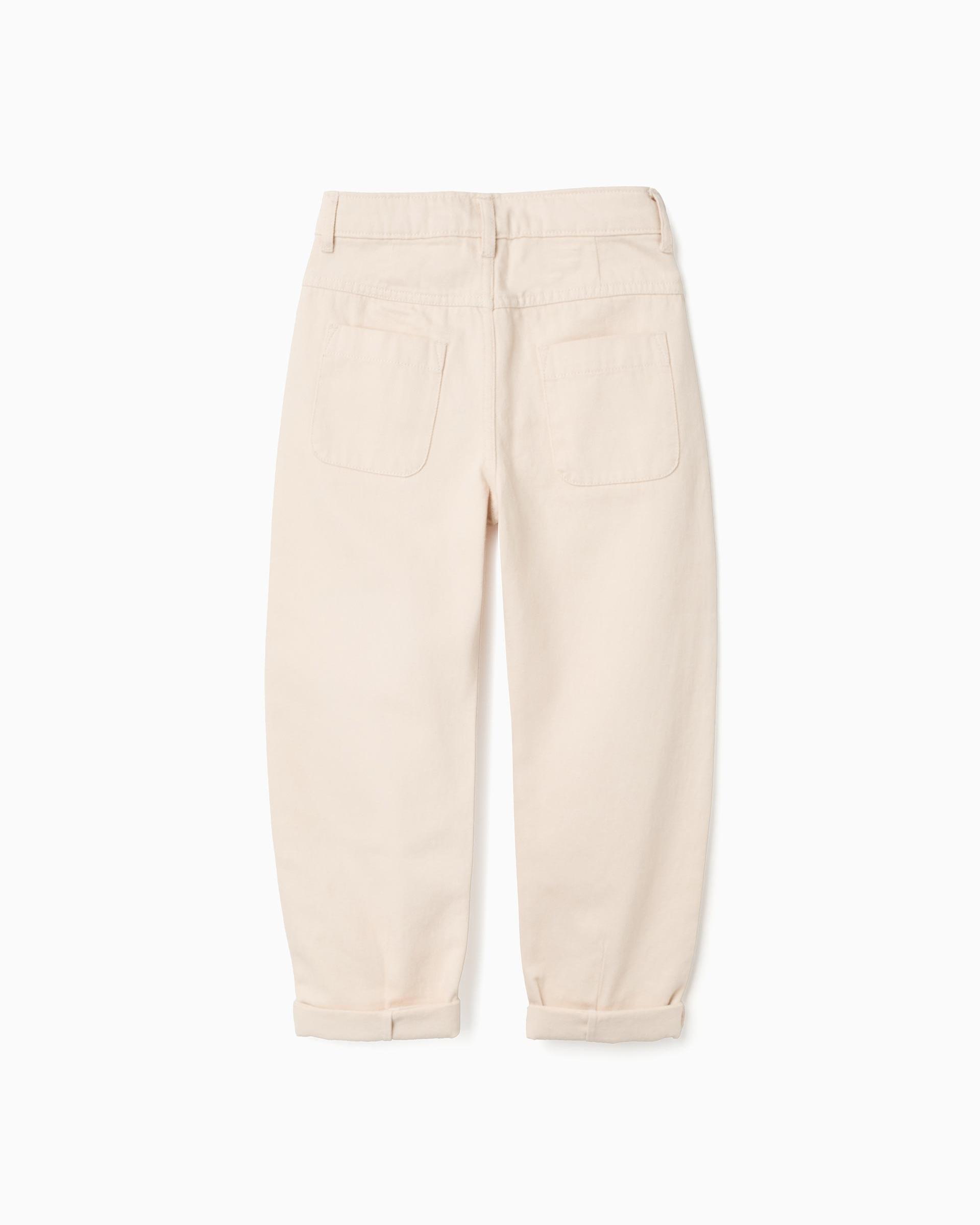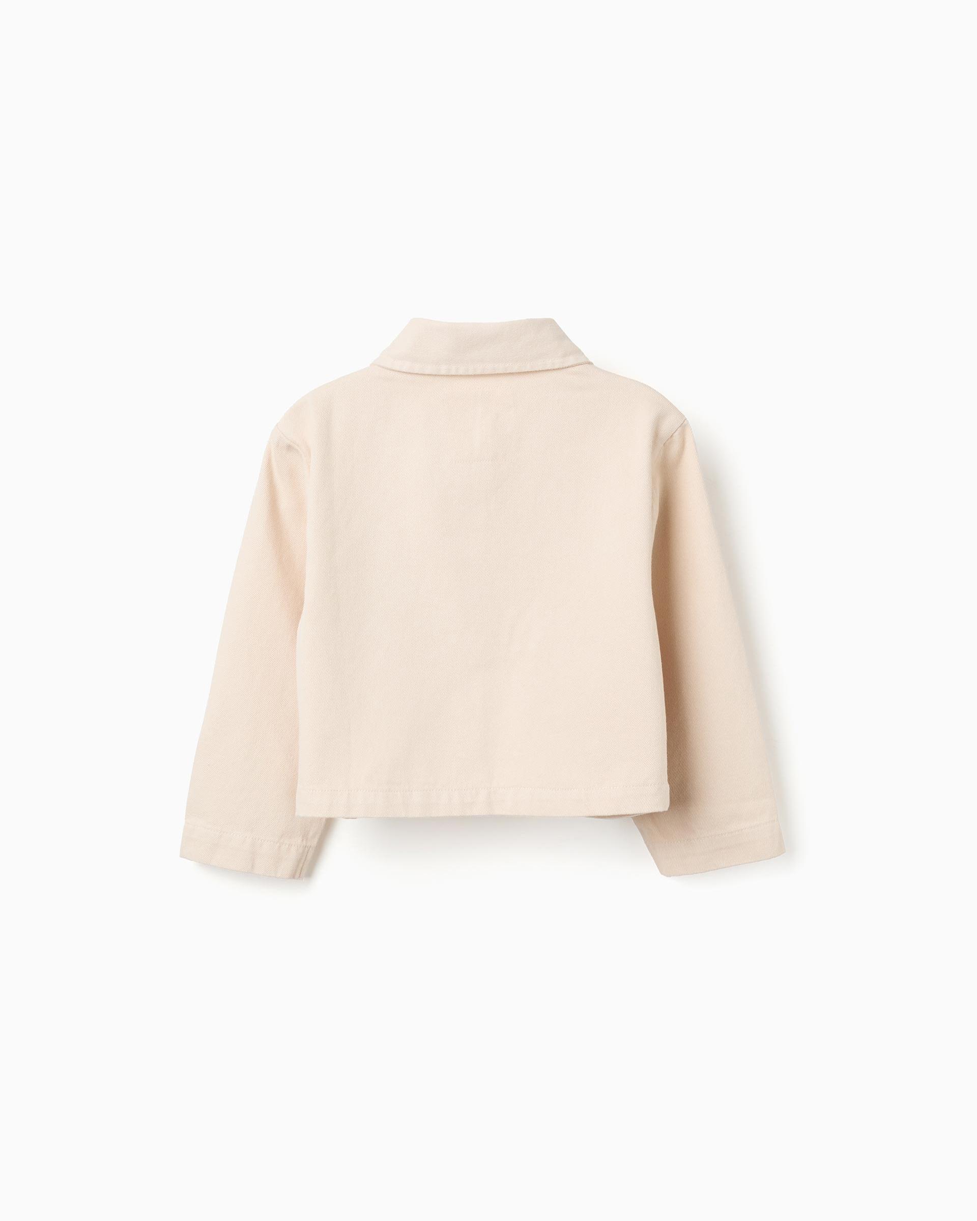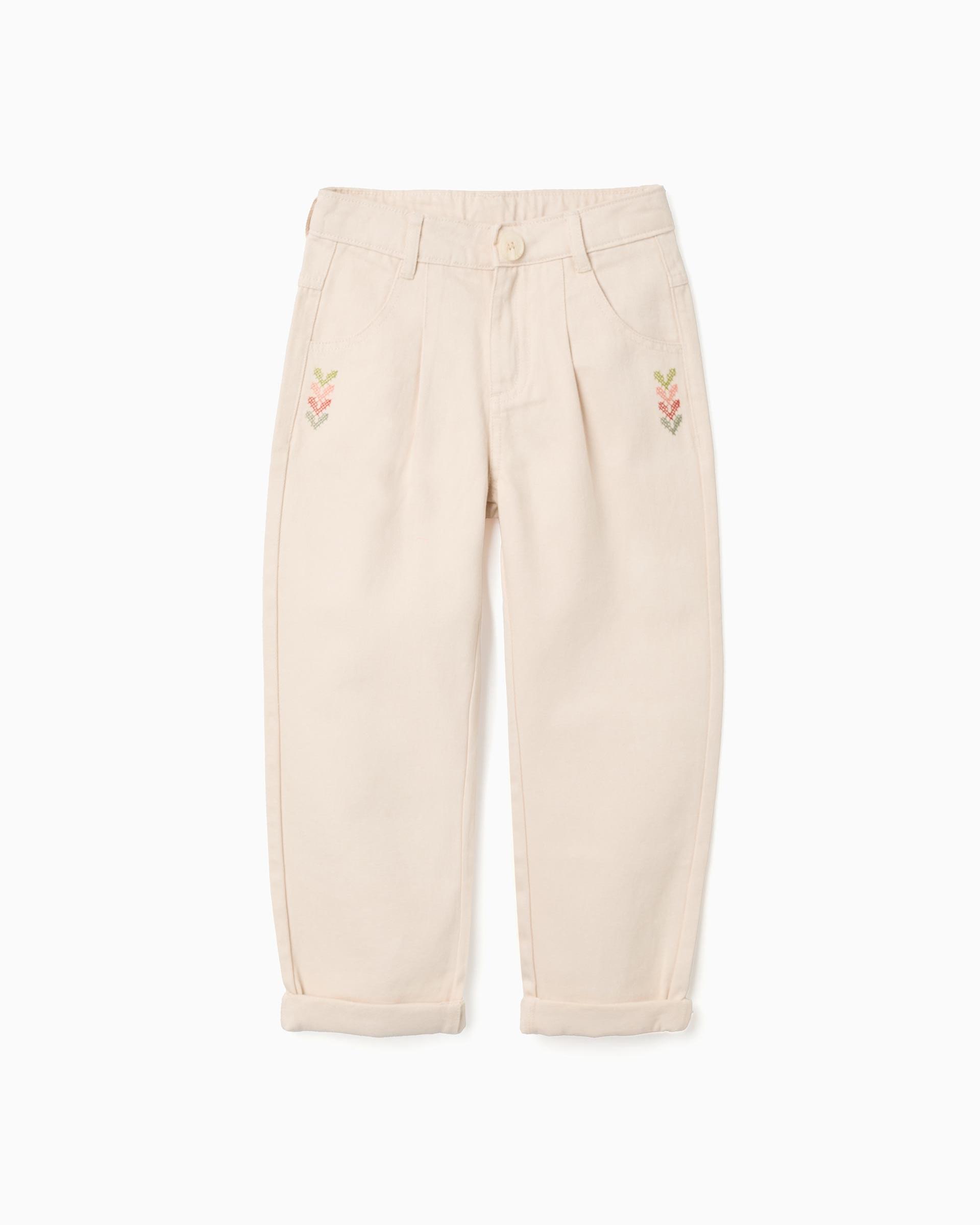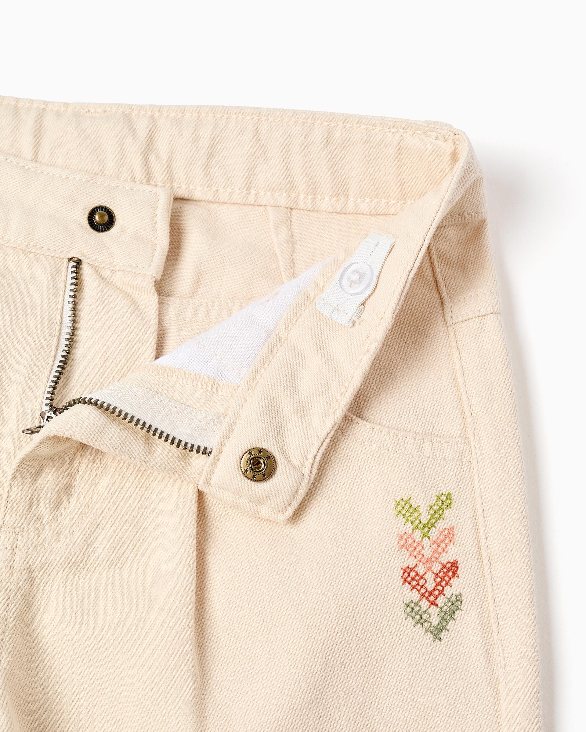Σετ το οποίο αποτελείται από τζιν μπουφάν σε κλασική γραμμή και baggy παντελόνι σε μπεζ απόχρωση με κεντητές χρωματιστές καρδιές.