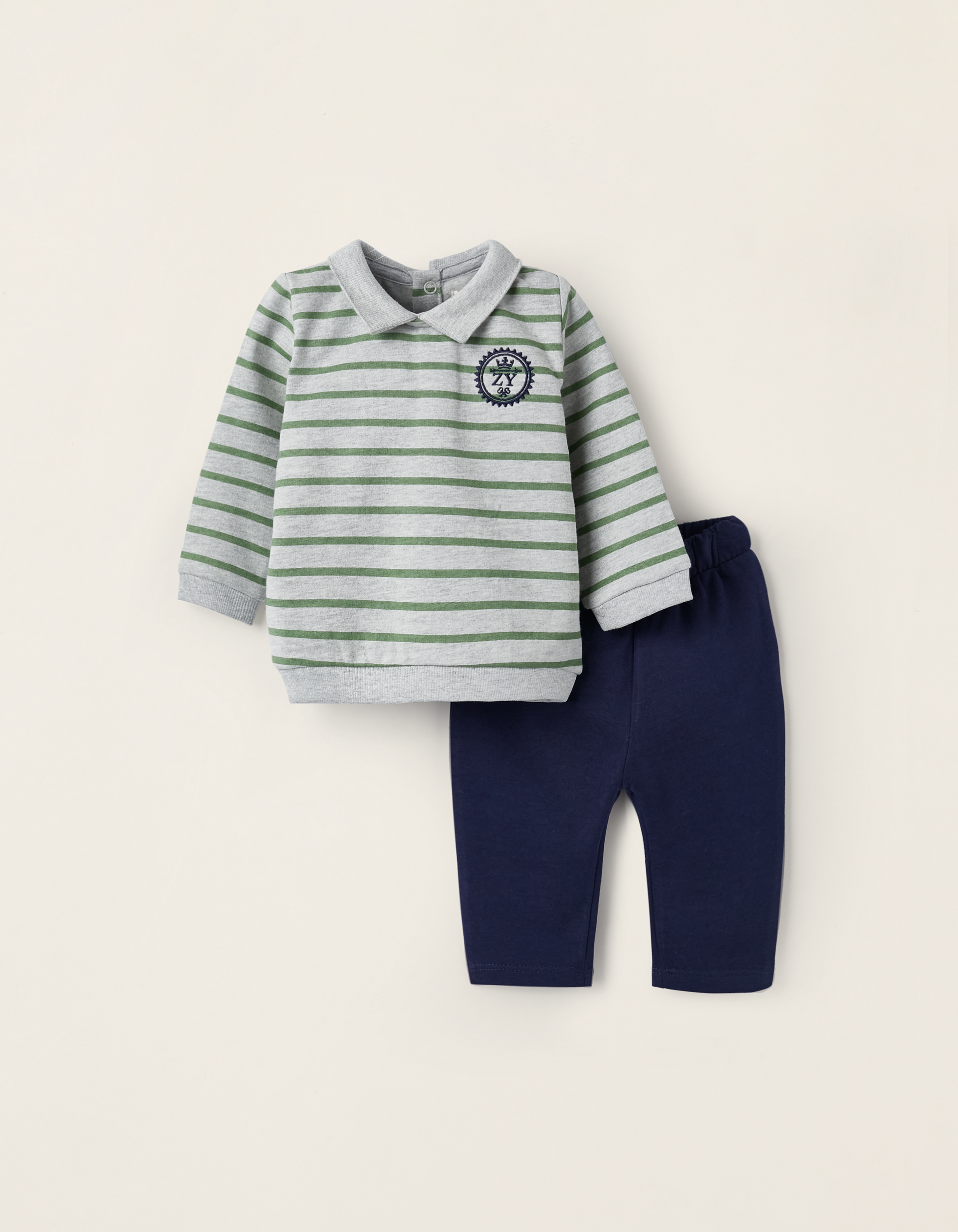Αποτελείται από γκρι μπλουζάκι φούτερ με ρίγες λαδί, γιακαδάκι