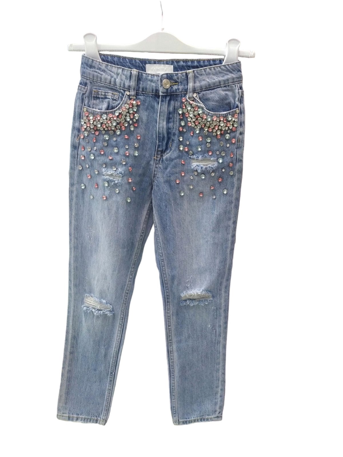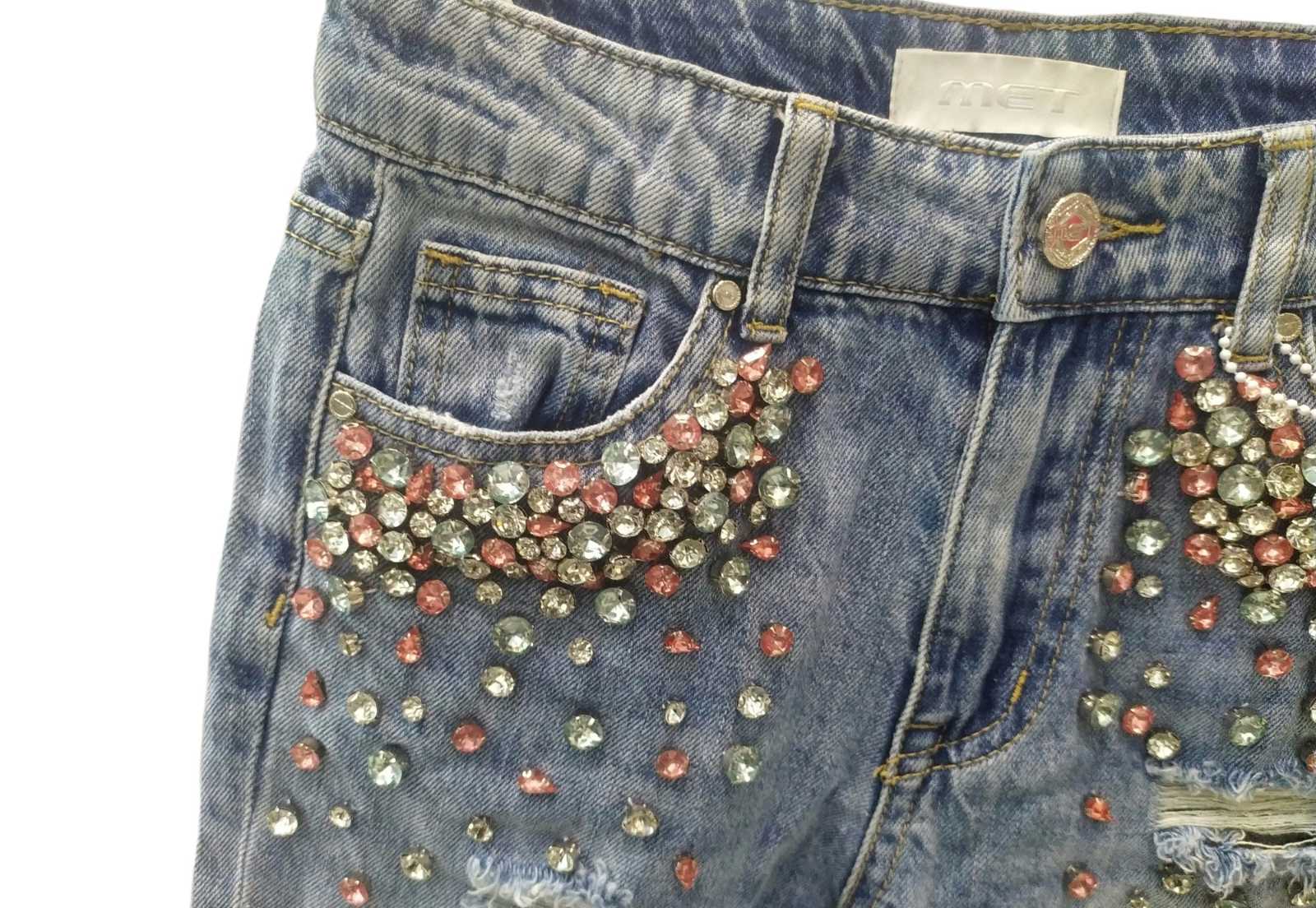 Τζιν παντελόνι της εταιρείας MET σε στενή γραμμή, στολισμένο με διακοσμητικές χρωματιστές πέτρες και φθορές, σκίσιμο στα γόνατα.