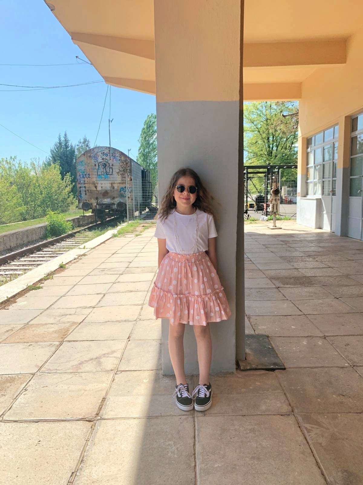 Φούστα σε ροζ χρώμα με πουά σχέδιο. Λάστιχο στη μέση και βολάν στο τελείωμα της φούστας. Φόδρα στο εσωτερικό της φούστας.