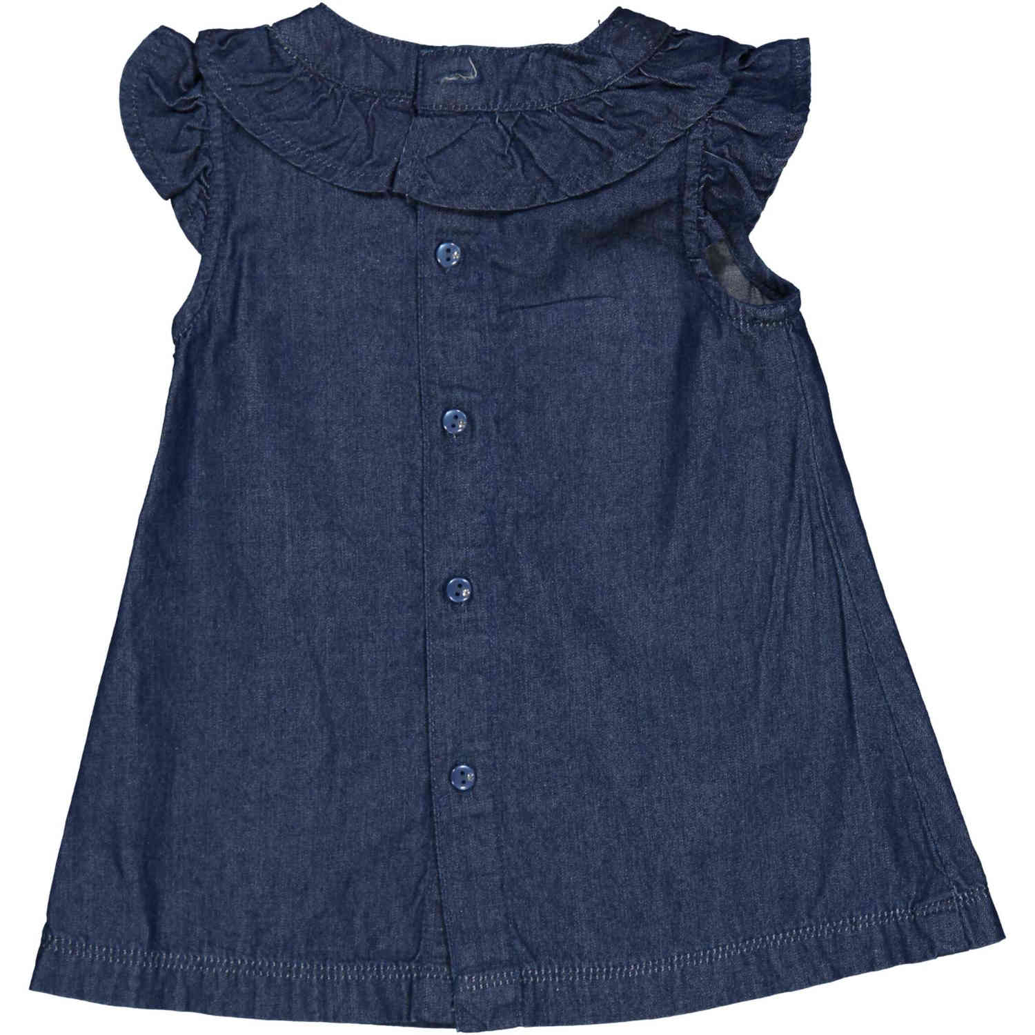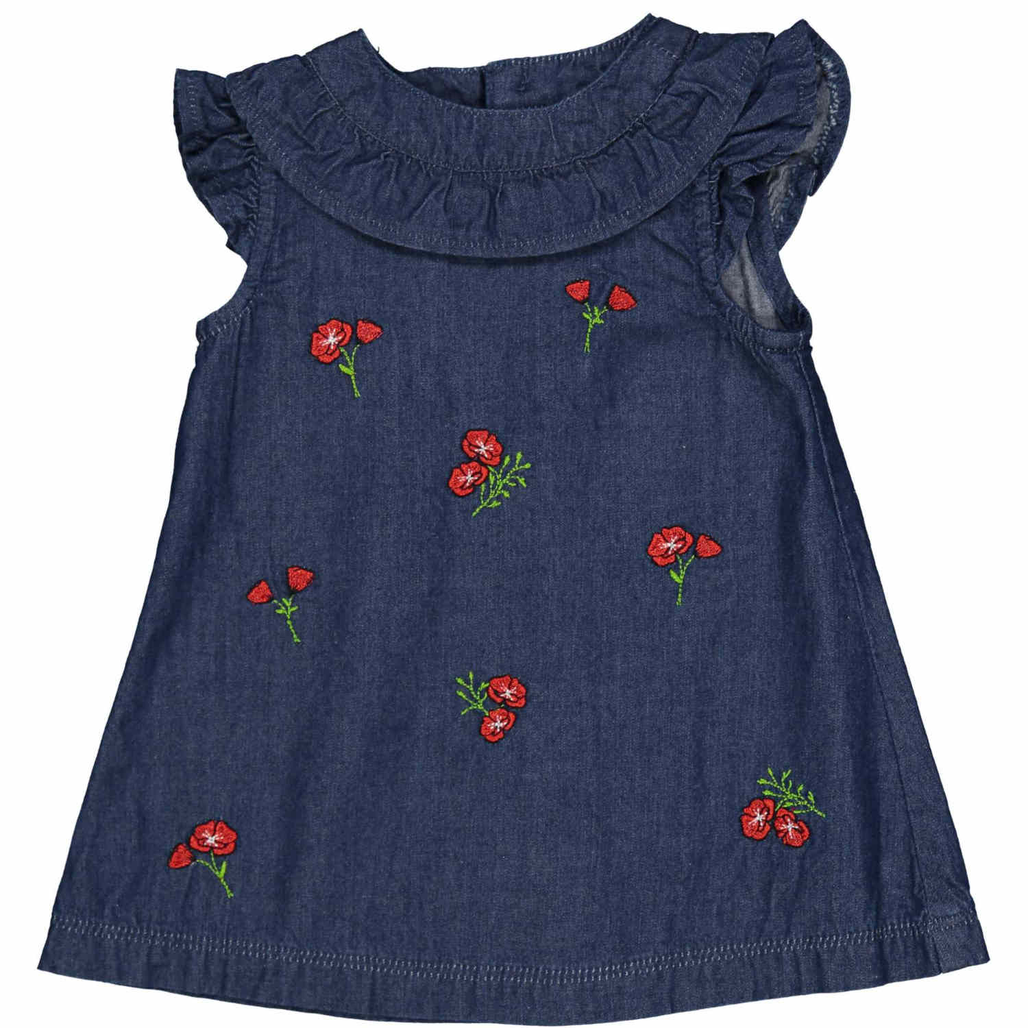 Τζιν μπλε φόρεμα με κεντητά κόκκινα λουλούδια και βολάν στη λαιμόκοψη.