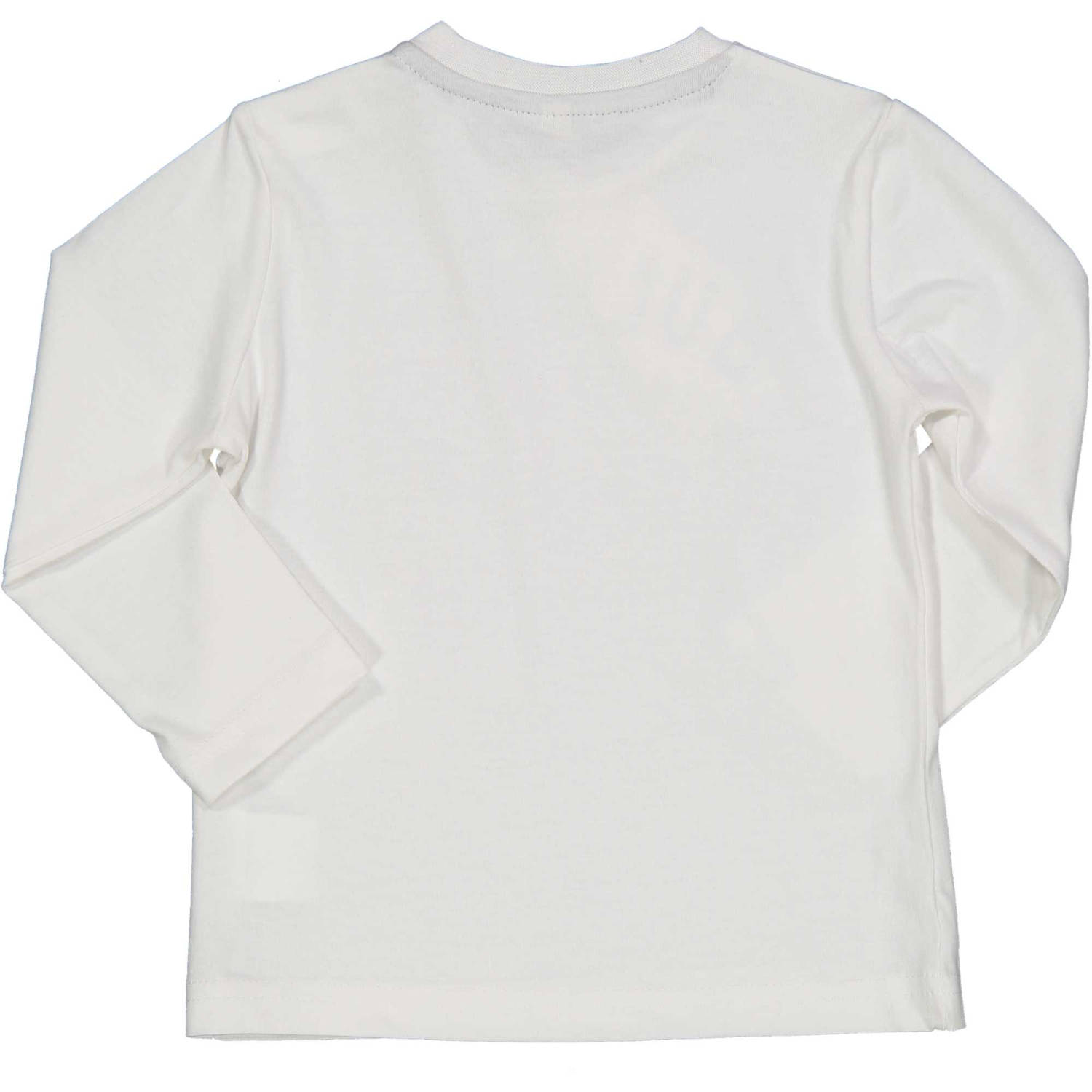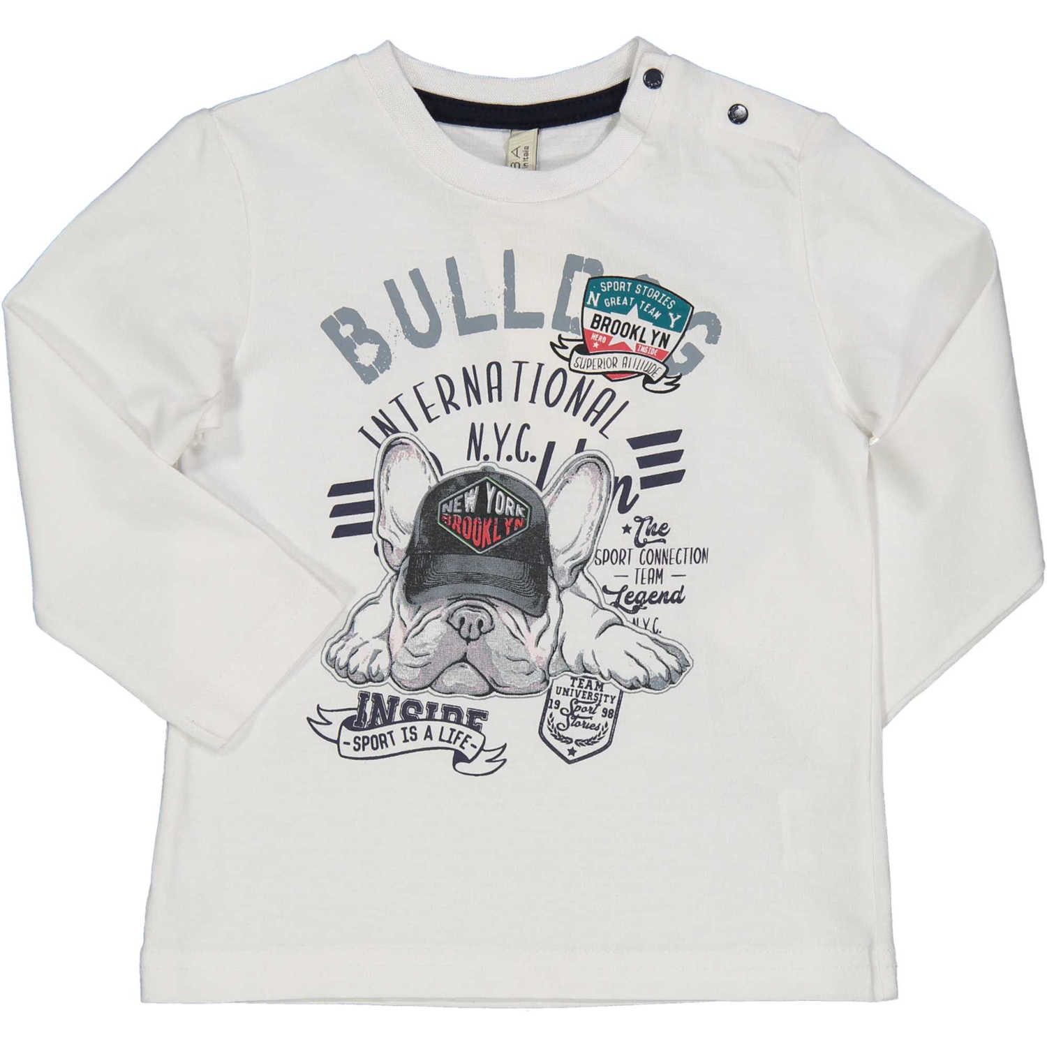 Λευκό βρεφικό μπλουζάκι για αγόρια με μακρύ μανίκι. Κλείσιμο με κουμπιά στον ώμο για πιο εύκολη εφαρμογή. Τύπωμα μπροστά.