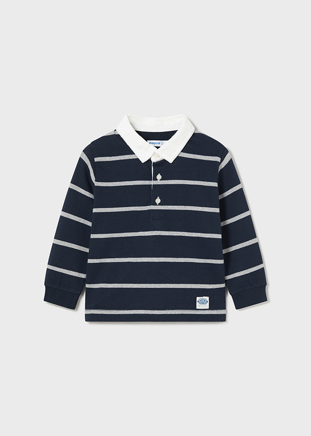 Μακρυμάνικη μπλούζα ριγέ σε μπλε σκούρα απόχρωση με λευκό γιακά. Κλείνει με κουμπιά.