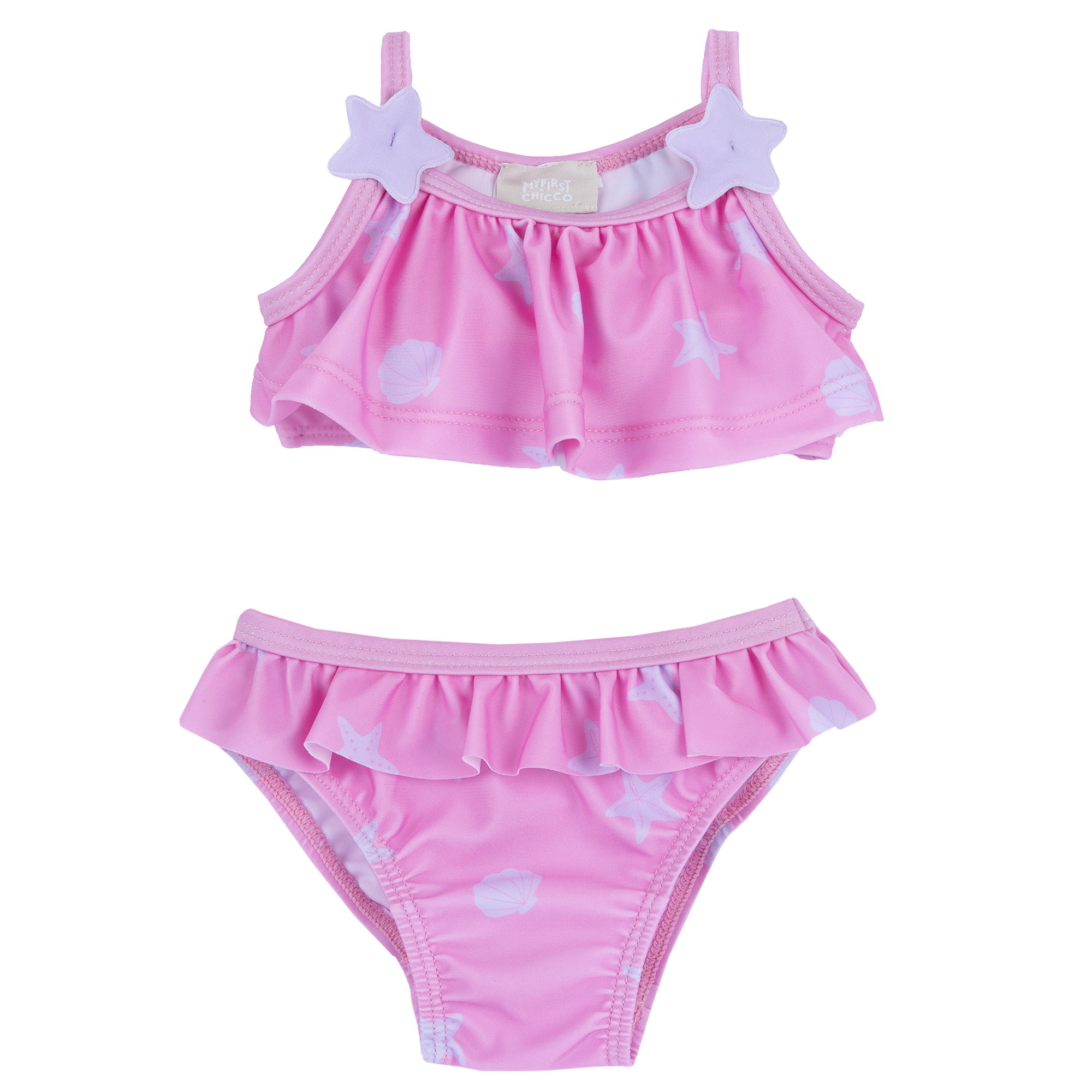 Βρεφικό μπικίνι για κορίτσια με βολάν της εταιρείας Chicco. Ροζ απόχρωση με μοτίβο μωβ αστέρια.