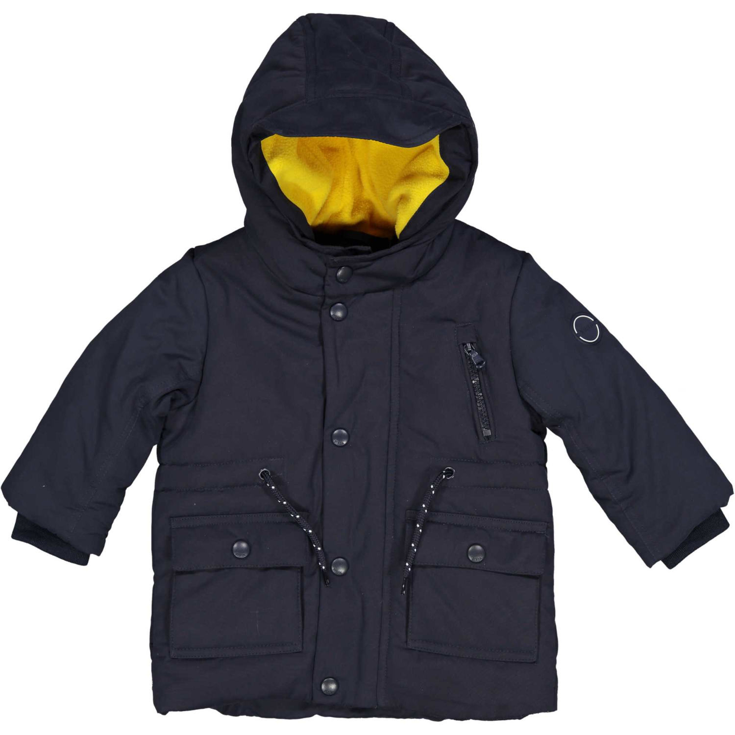 Μπουφάν βρεφικό σε μπλε χρώμα με κίτρινη φλις επένδυση. Τρείς τσέπες μπροστά και μέση που προσαρμόζεται ανάλογα με το σώμα του μωρού σας.