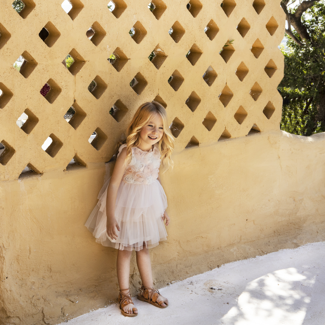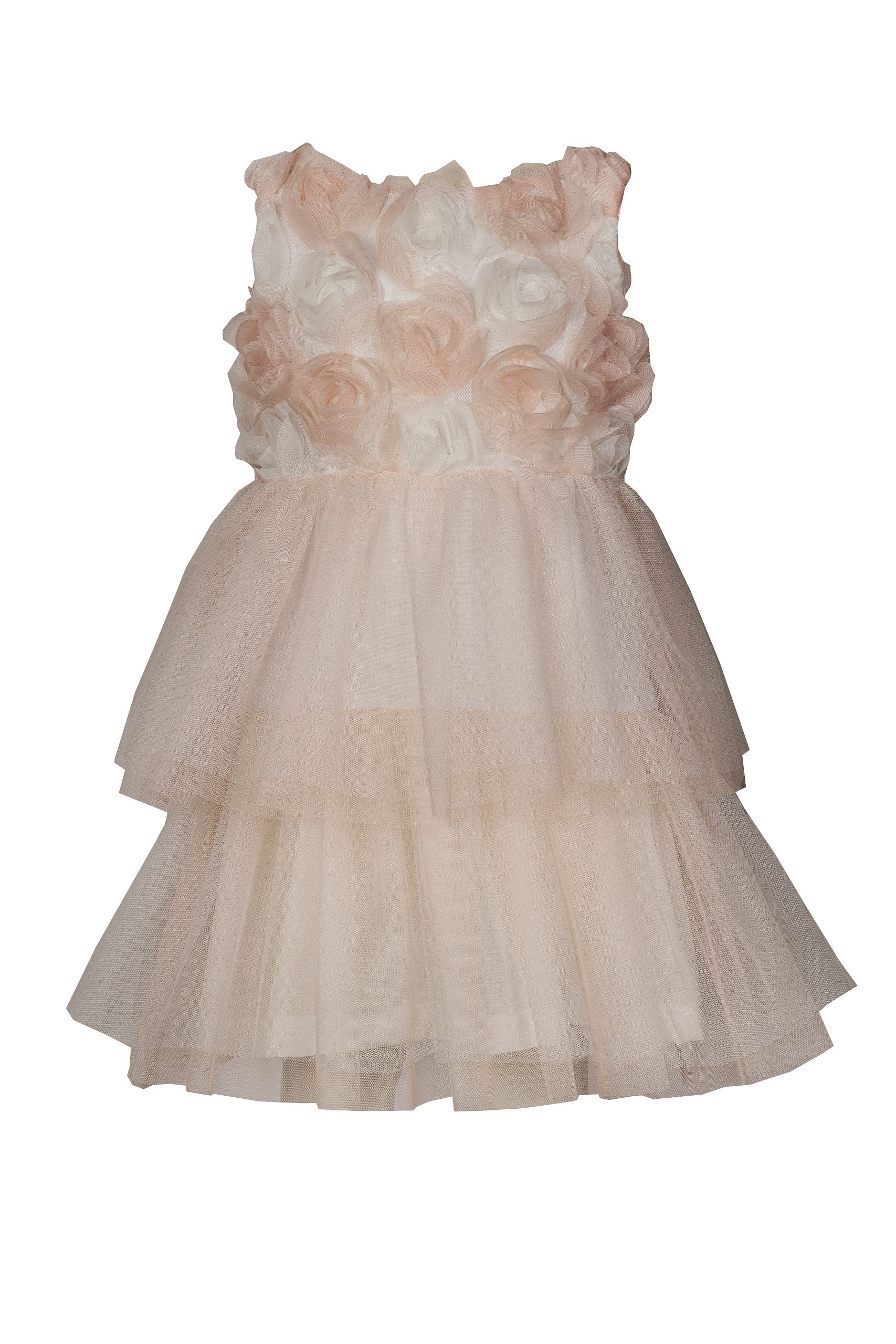 Αμάνικο φόρεμα με τούλι σε ροζ απόχρωση με κρεμ “πινελιες”. Κεντημένα διακοσμητικά λουλούδια από τούλι στην πλάτη και το στέρνο . Στρογγυλή λαιμόκοψη. Φόδρα στο εσωτερικό του φορέματος από 100% βαμβάκι. Κλείσιμο με φερμουάρ στο πίσω μέρος.