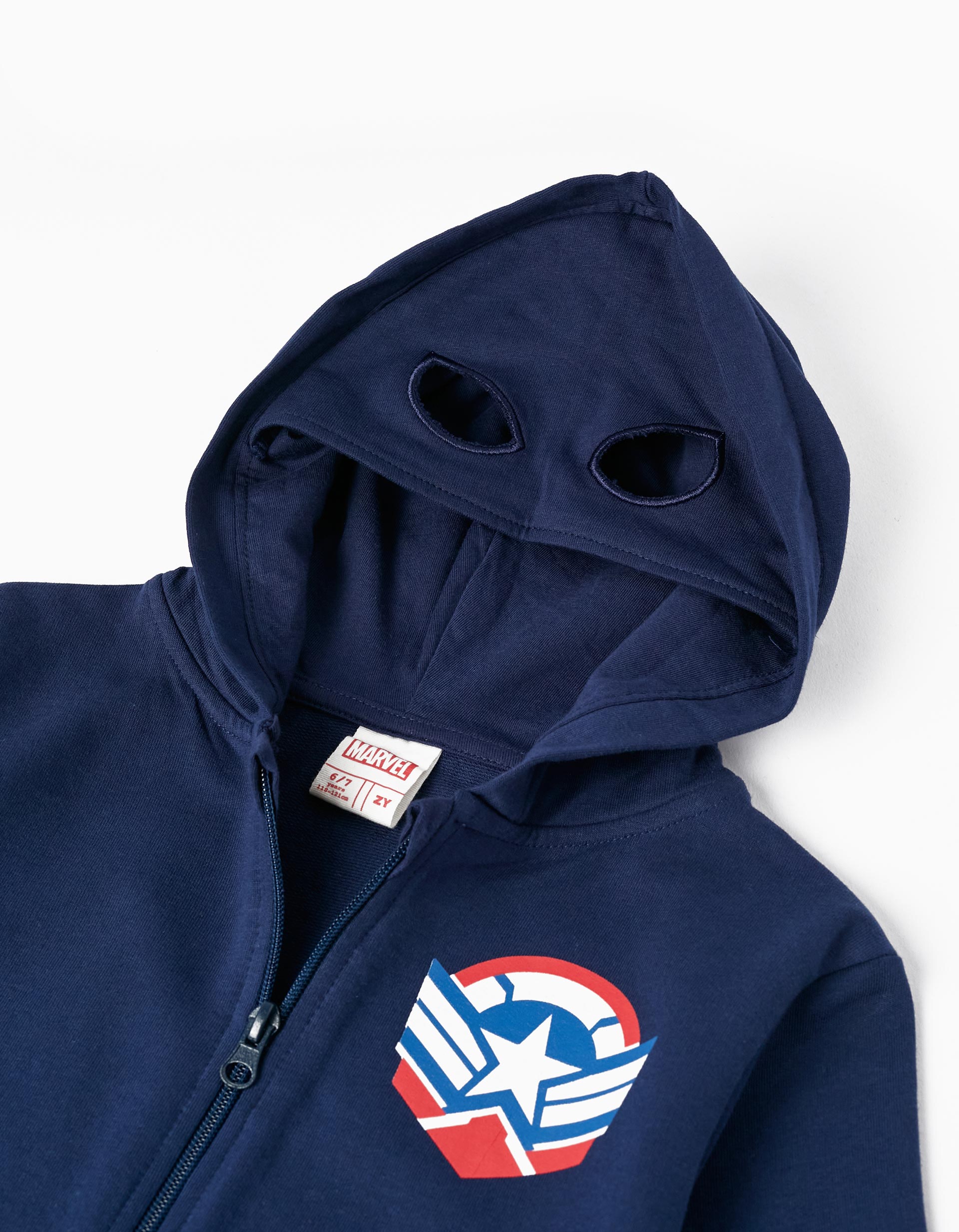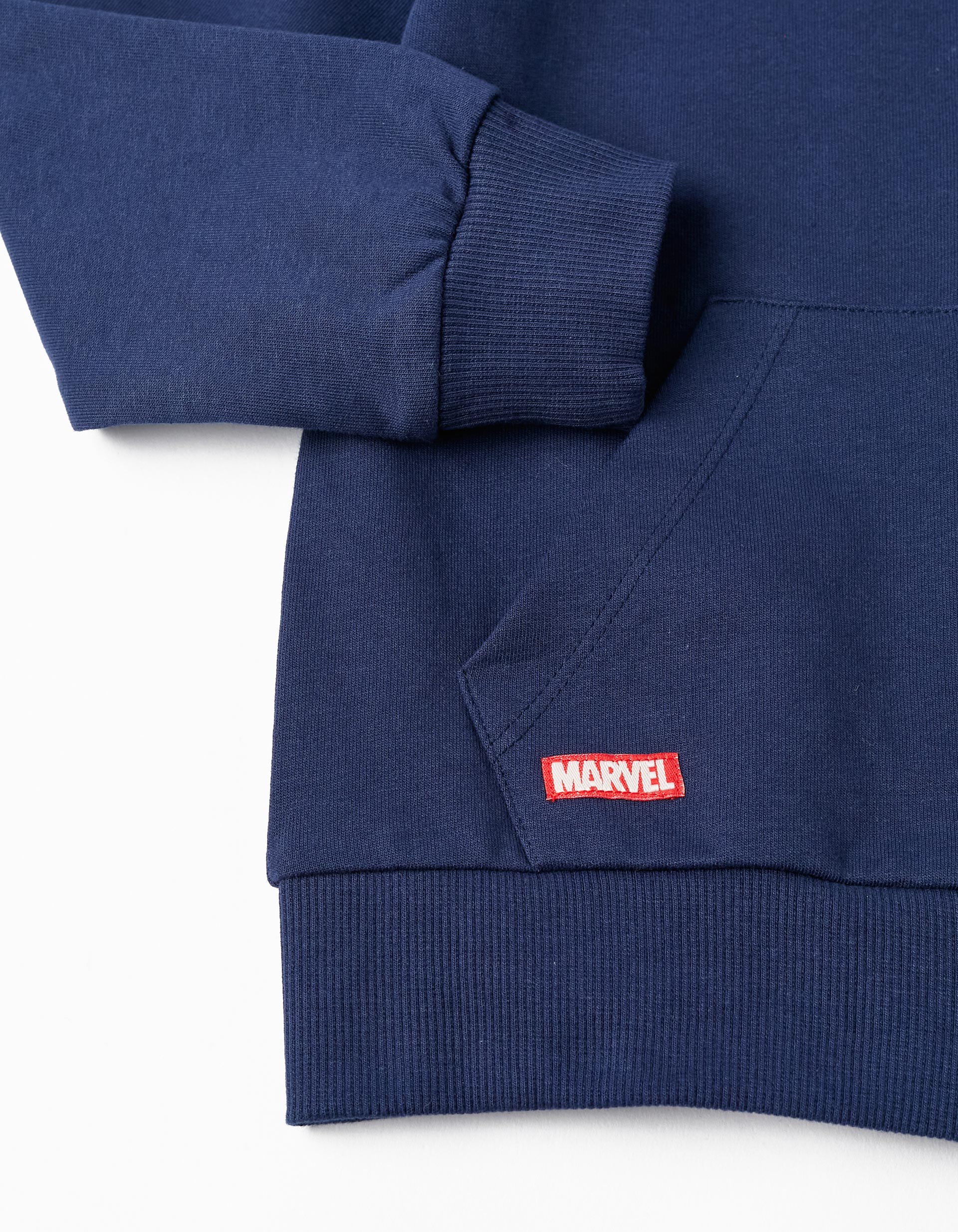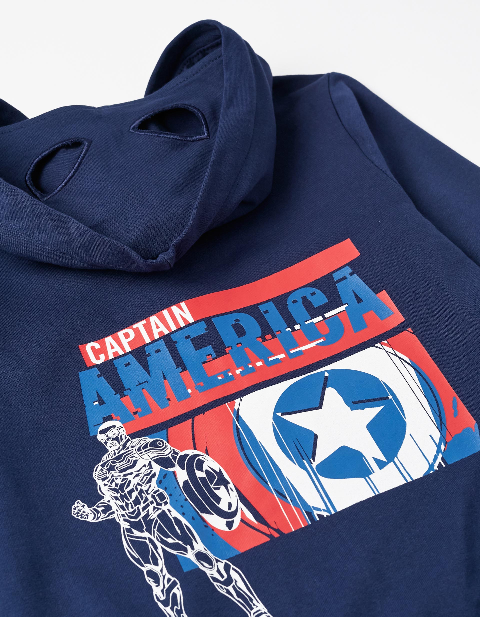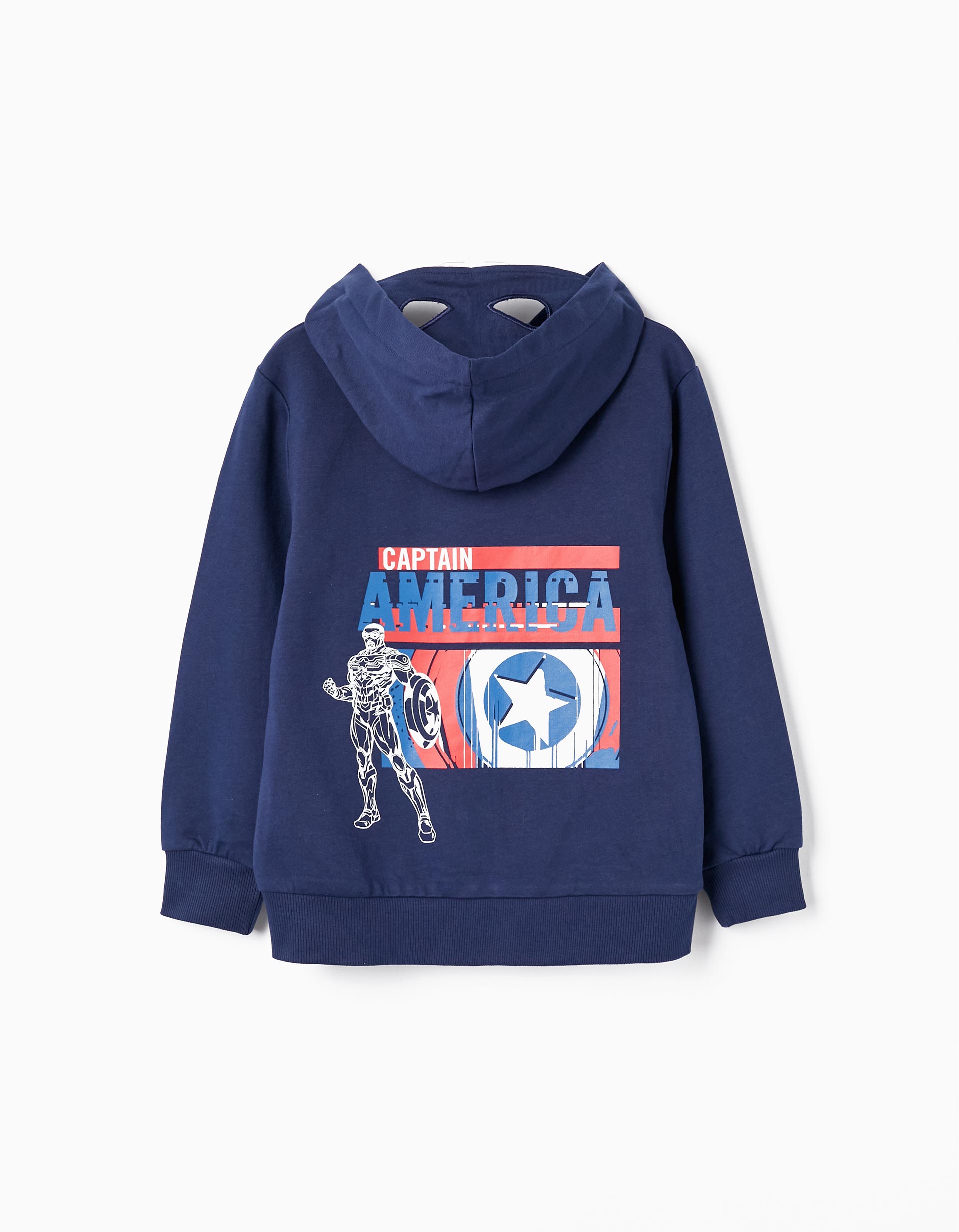 Μακρυμάνικη ζακέτα με κουκούλα για αγόρια σε σκούρο μπλε χρώμα. Κουκούλα με εφέ μάσκας ήρωα Captain America. Κλείσιμο μπροστά με φερμουάρ. Δύο μπροστινές τσέπες. Μικρή μπροστινή στάμπα στο στήθος και μεγάλη στάμπα στην πλάτη.