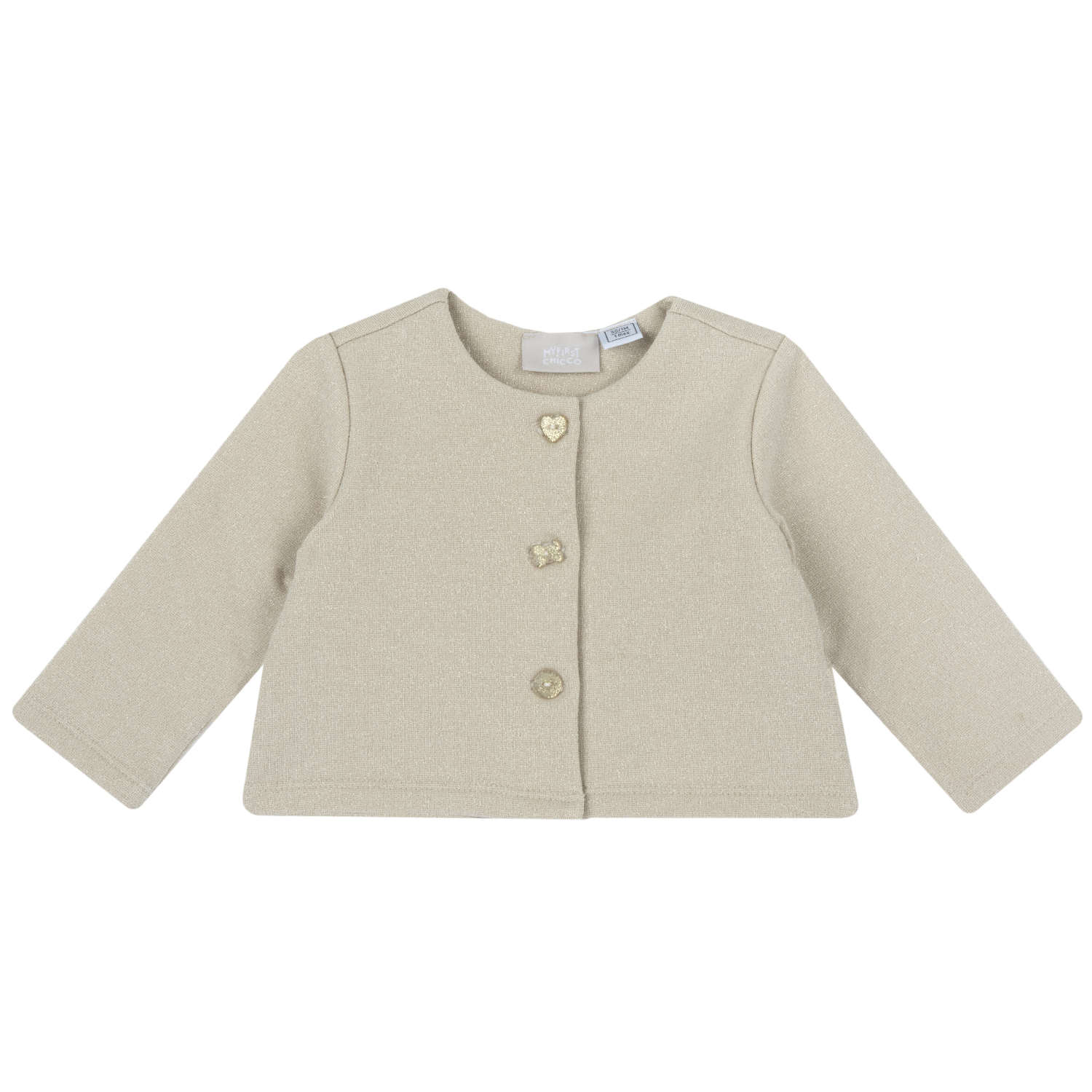 Ζακετάκι Chicco σε μπεζ/χρυσό με μεταλλιζέ κλωστή.