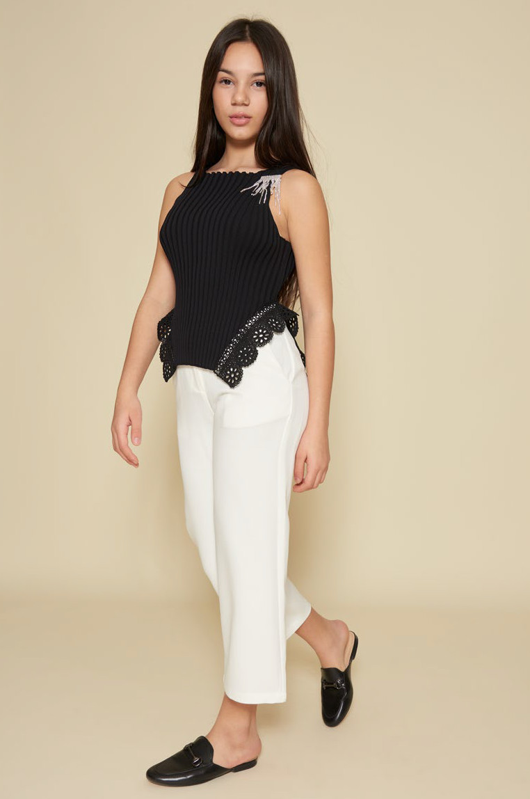 Πλεκτό αμάνικο τοπ σε λευκό χρώμα με δαντέλα στο πλάι. Το τοπ παραδίδεται με αποσπώμενη διακοσμητική καρφίτσα.