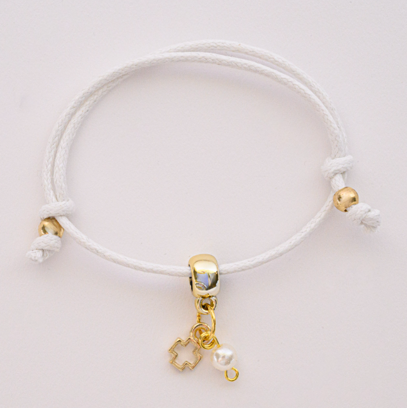 Μοντέρνα μαρτυρικά βραχιόλια βάπτισης με λευκό διπλό κορδόνι, επίχρυσο σταυρό και λευκή πέρλα.