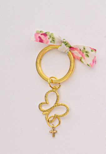 Μοντέρνα μαρτυρικά βάπτισης μπρελόκ με επίχρυσο αντικείμενο, σταυρό και υφασμάτινο φλοράλ φιόγκο.
