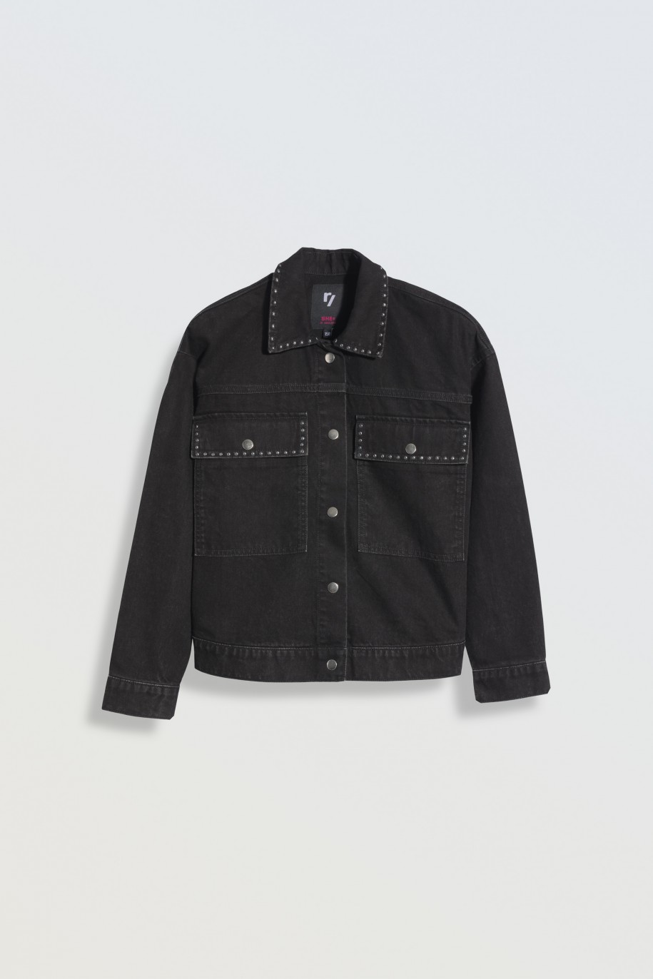 Μαύρο τζιν μπουφάν στο μήκος της μέσης με διακοσμητικά τρουκς. Δύο τσέπες στο ύψος του στήθους και γιακά στη λαιμόκοψη. Κλείνει με κουμπιά.