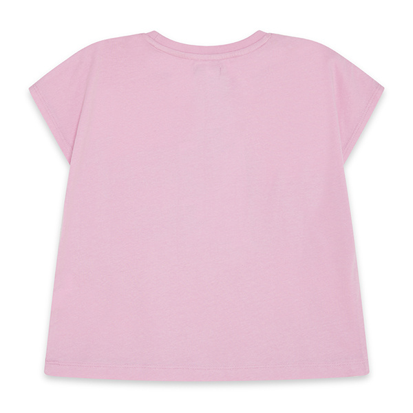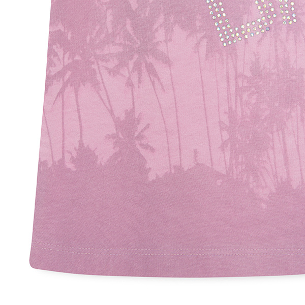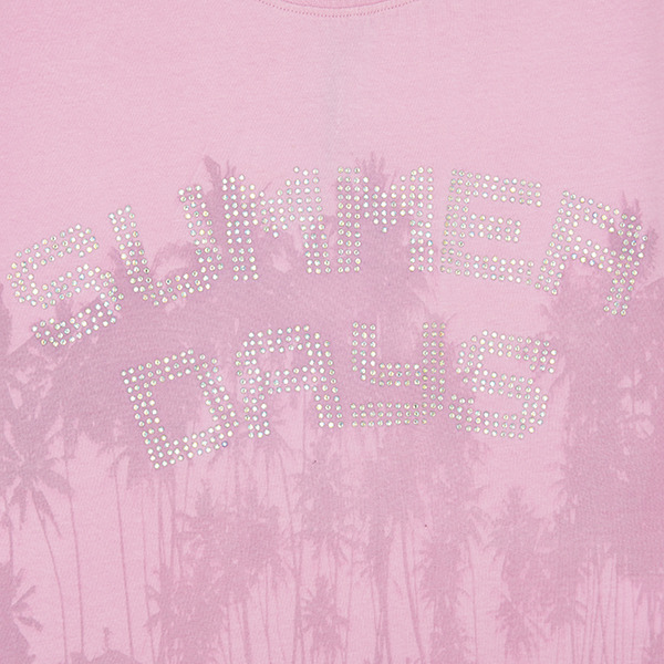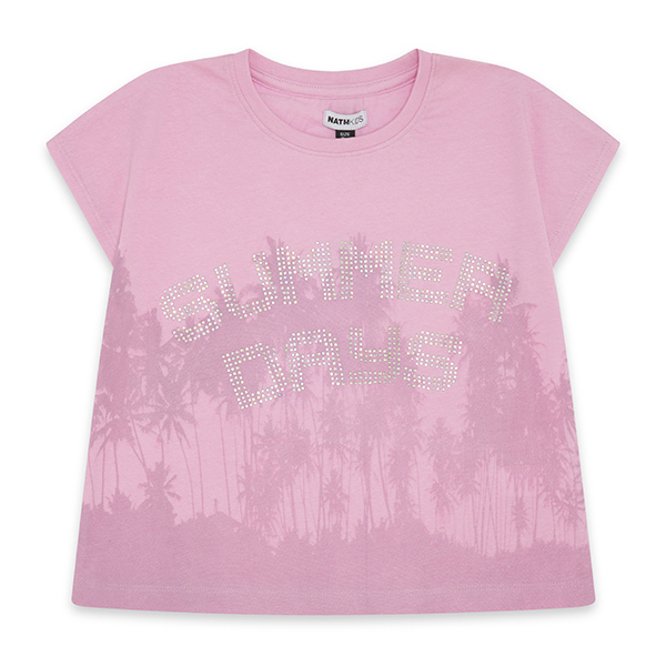 Ροζ κοντομάνικη βαμβακερή μπλούζα με σχέδια φοίνικες και “Summer days” στρας.