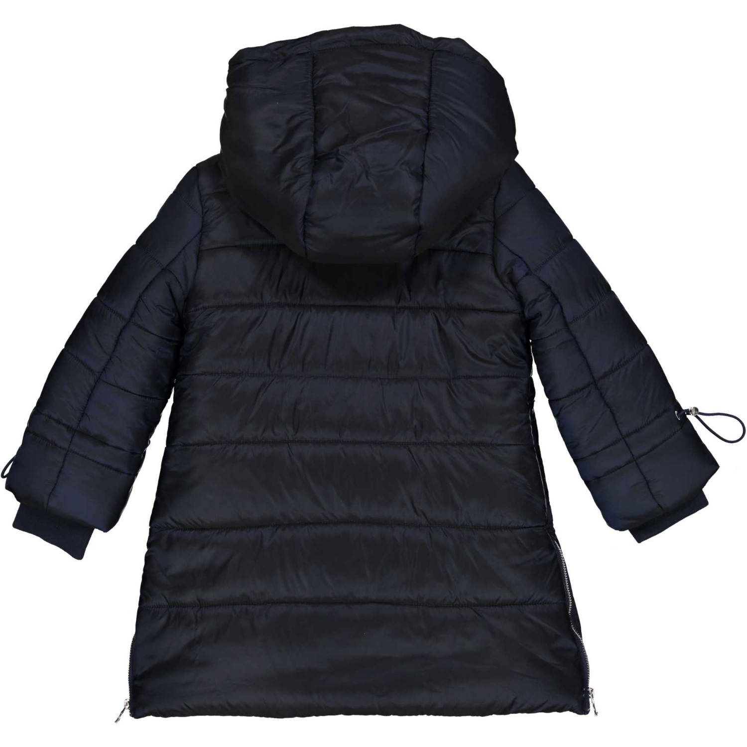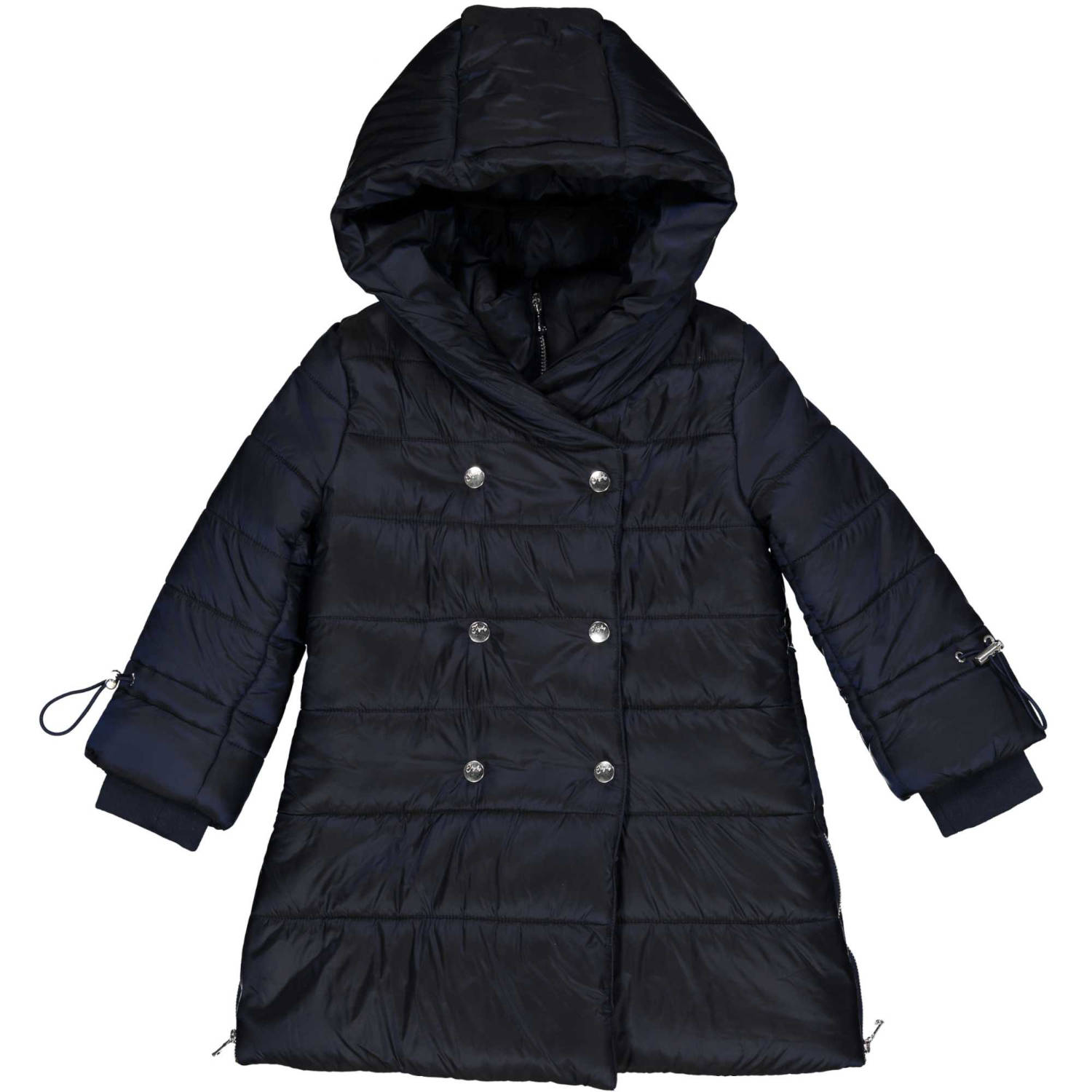 Μπουφάν μακρύ σε σκούρο μπλε χρώμα με ενσωματωμένη κουκούλα. Δύο τσέπες στο πλάι που κλείνουν με φερμουάρ. Φερμουάρ στο πλάι και μανίκια που μαζεύουν. Κλείνει με φερμουάρ και κουμπιά.