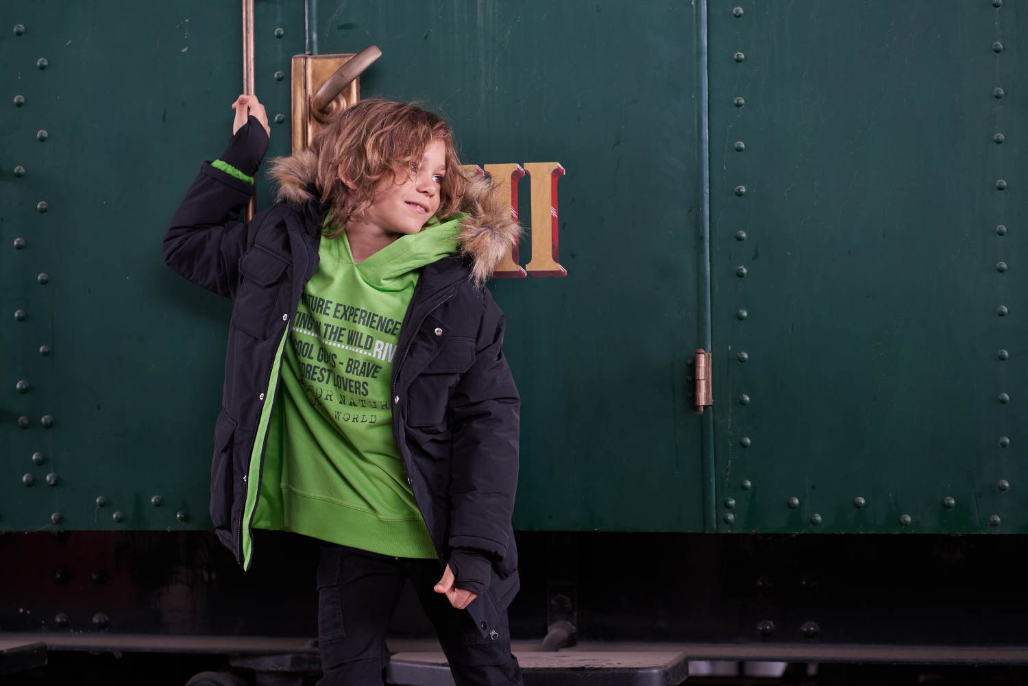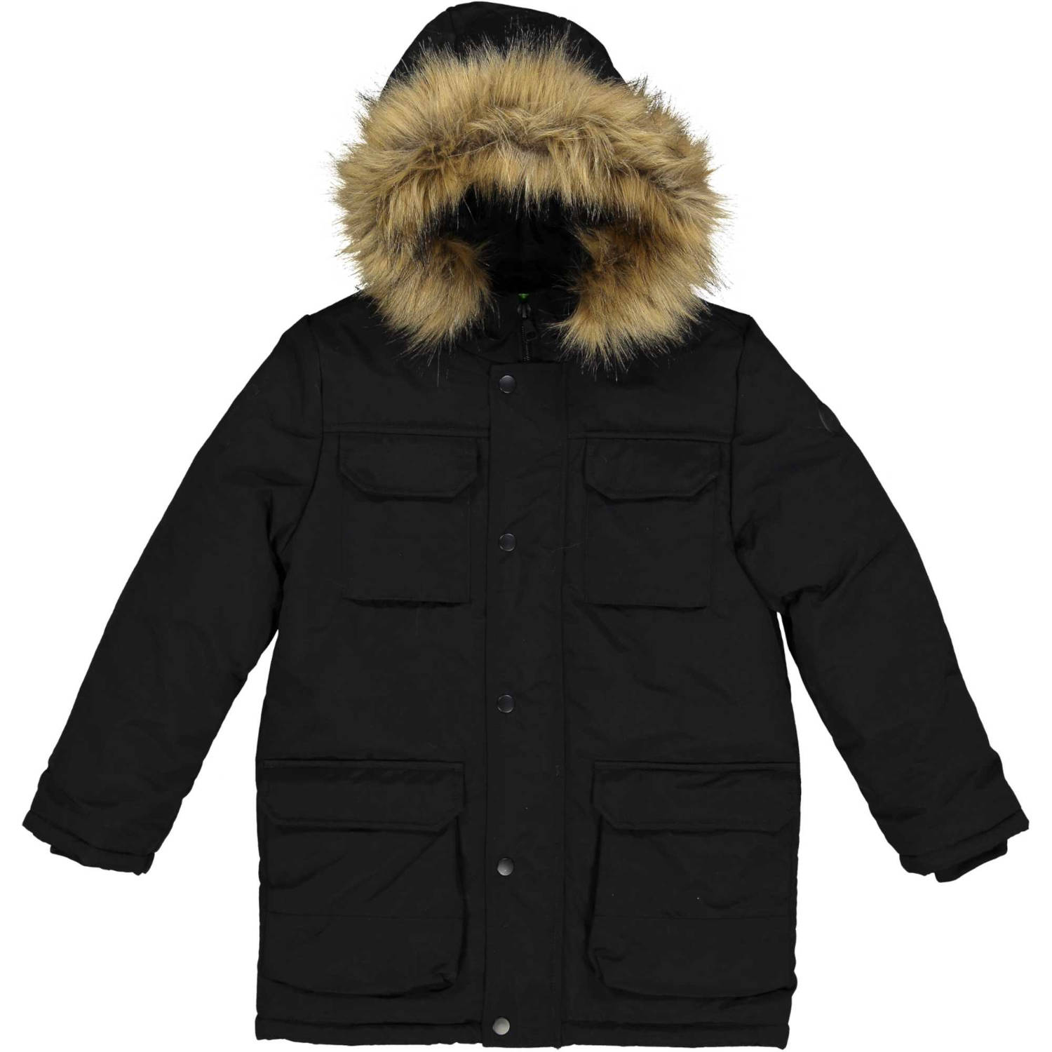 Μπουφάν σε μαύρο χρώμα με τσέπες. Κουκούλα με αποσπώμενη γούνα. Τέσσερις τσέπες μπροστά που κλείνουν με χρατς. Κλείνει με φερμουάρ και κουμπιά.