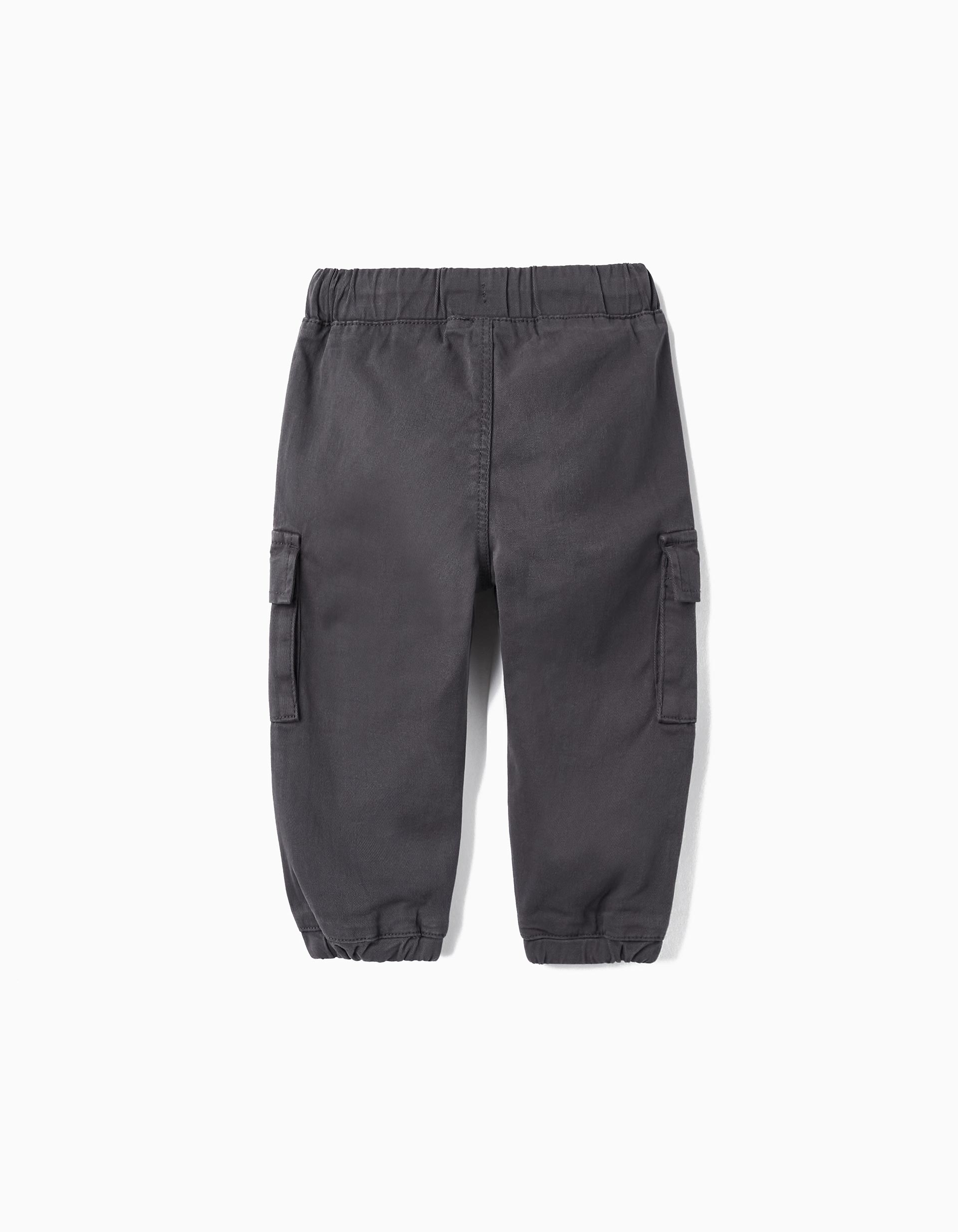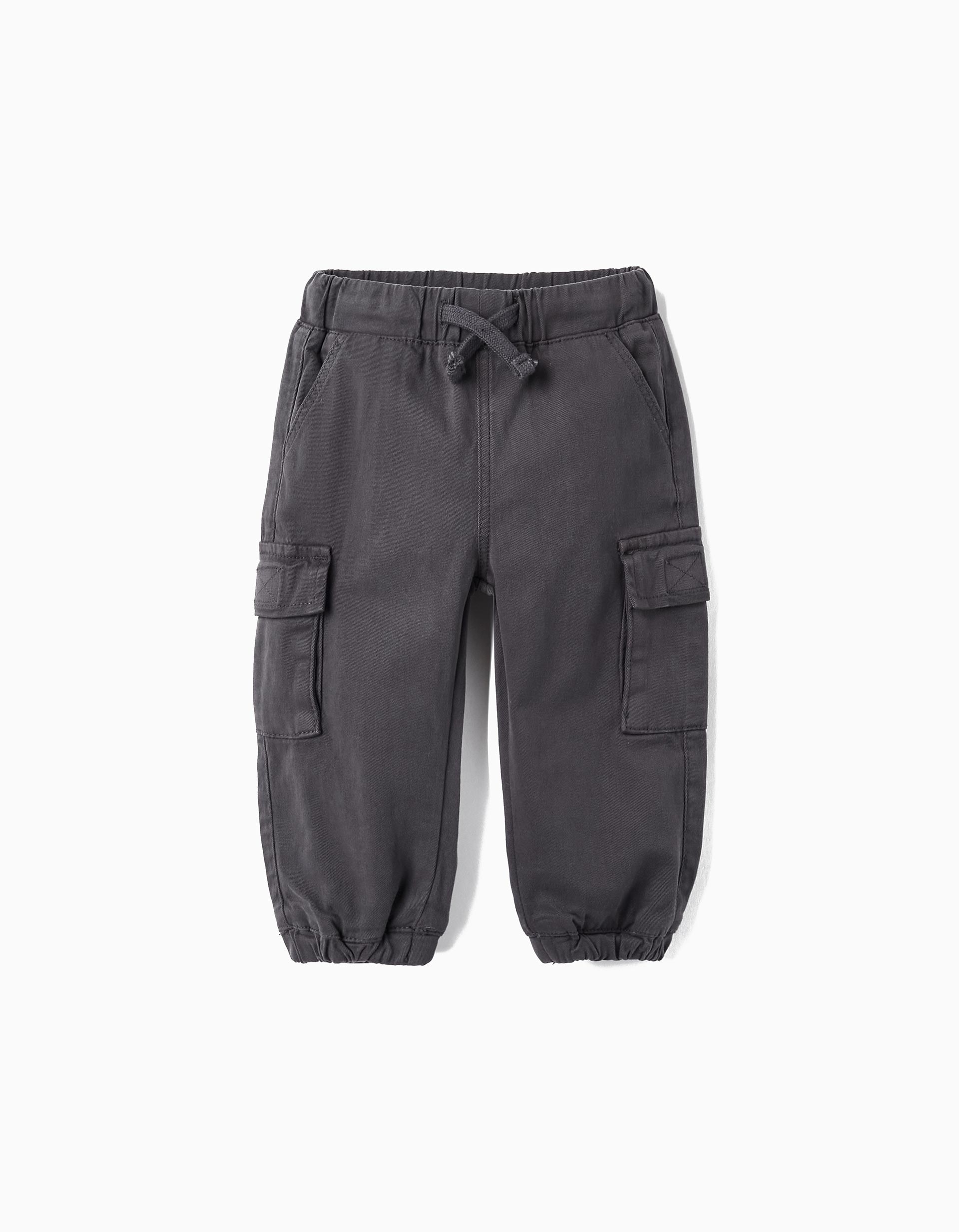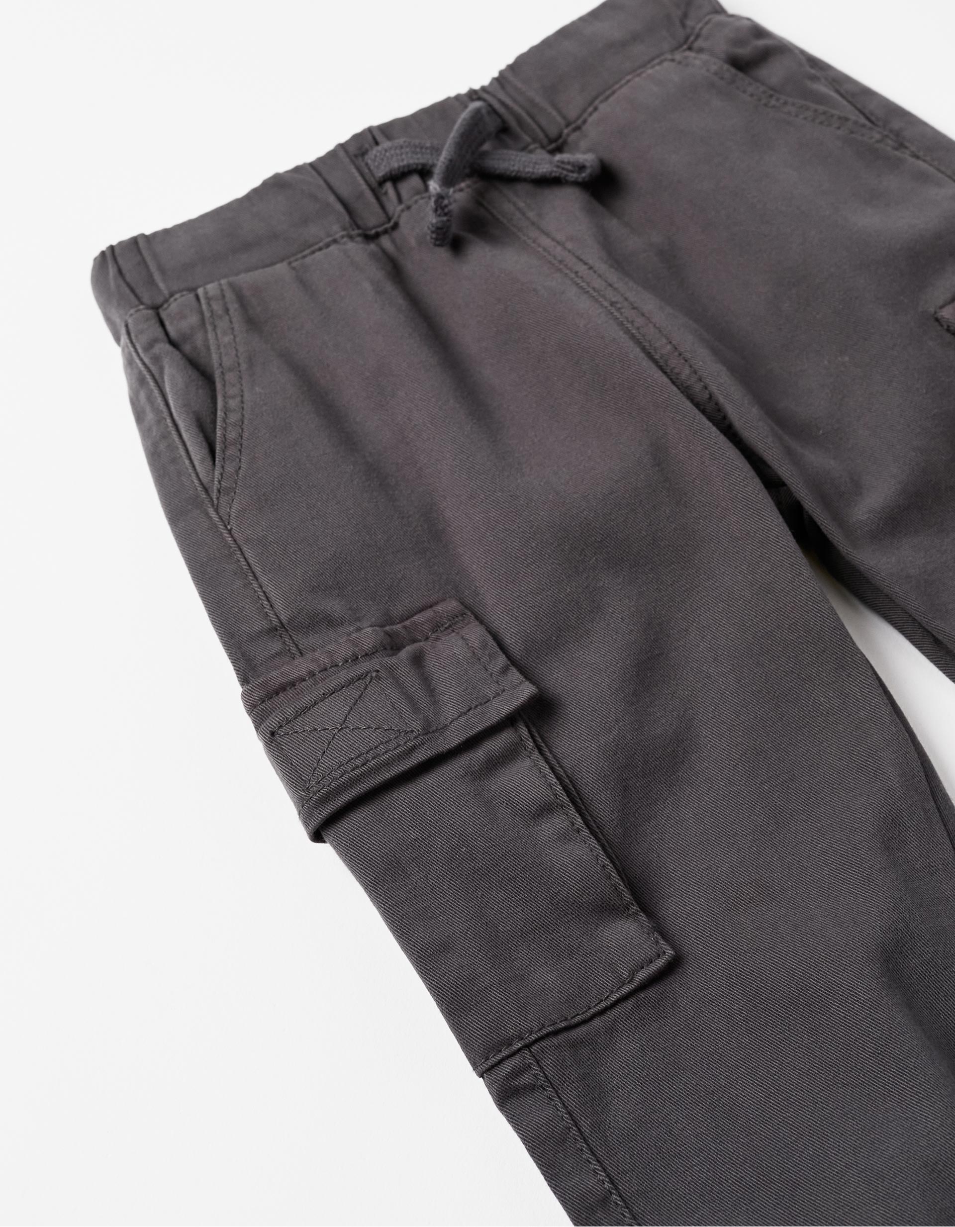 Cargo σε γκρι ανθρακί χρώμα με τσέπη στο πλάι κ λάστιχο με κορδόνι στη μέση. Λάστιχο στο τελείωμα