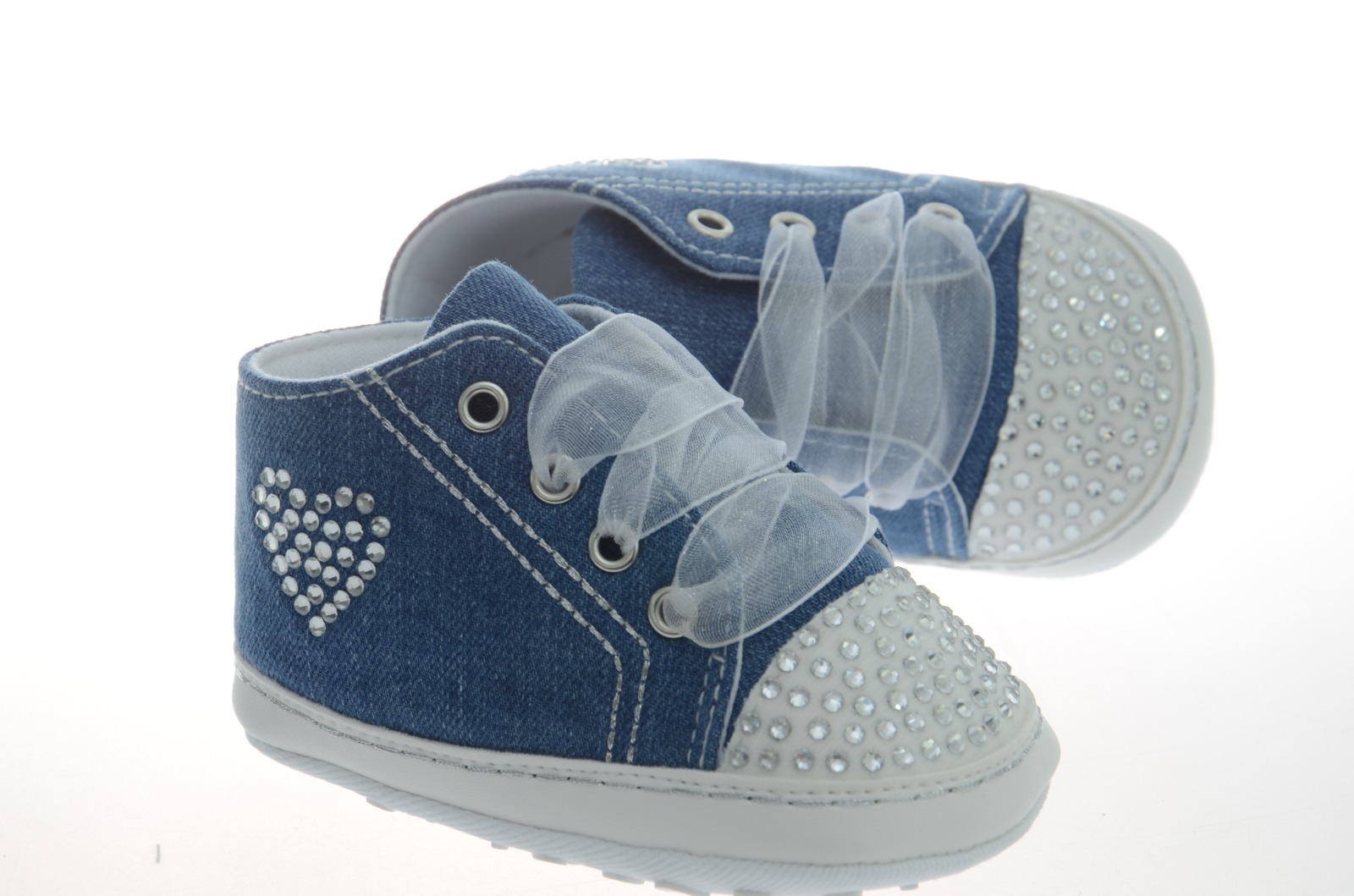 Παπούτσια αγκαλιάς για κορίτσια τύπου “sneakers” σε τζιν ύφασμα με στρας και κορδέλα οργάντζα. Για καθημερινές στυλάτες εμφανίσεις!
