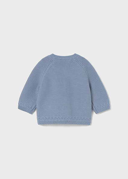 Πλεκτή βρεφική ζακέτα σε γαλάζια απόχρωση με μακριά μανίκια , στρογγυλεμένο γιακά και τσέπες. Κλείνει με κουμπιά
