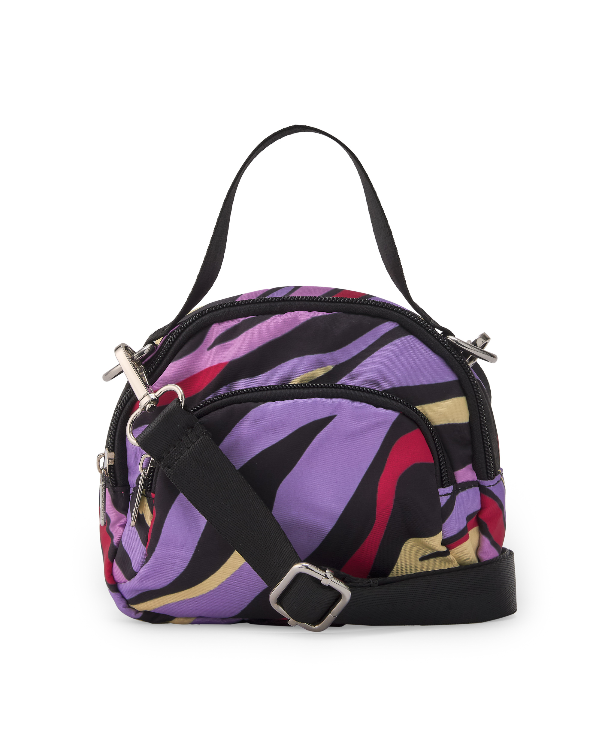 Πολύχρωμη υφασμάτινη τσάντα ώμου με λουρί και θέσεις αποθήκευσης.