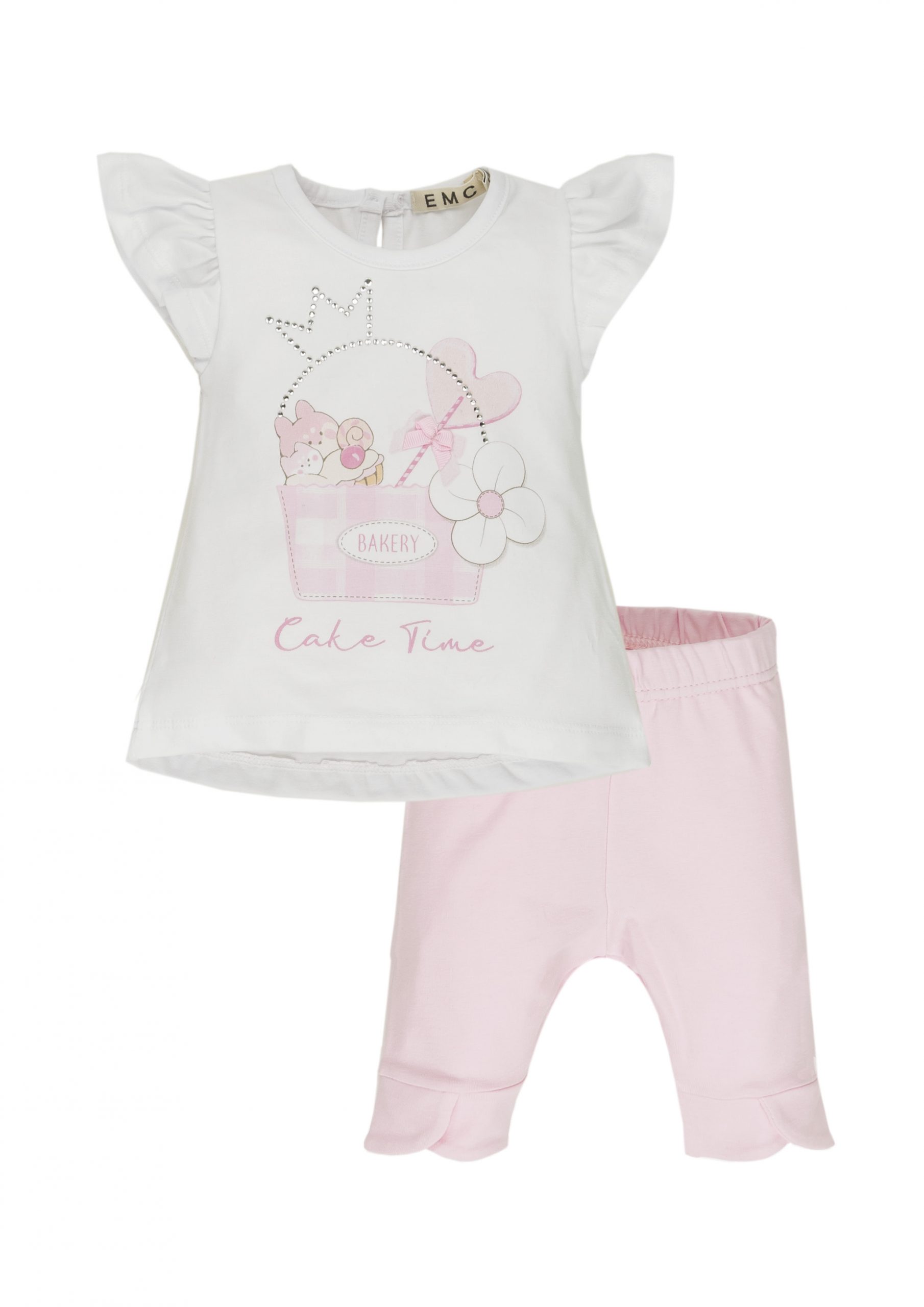 Σετ μπλούζα με κολάν EMC. Η μπλούζα σε λευκό χρώμα με βολάν στο μανίκι και σχέδια μπροστά και το κολάν σε ροζ χρώμα.