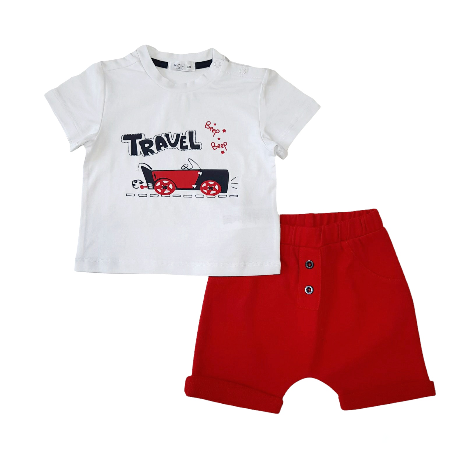 Βαμβακερή λευκή μπλούζα με τύπωμα αυτοκίνητο και ελαστικό βαμβακερό σορτς σε κόκκινο χρώμα.