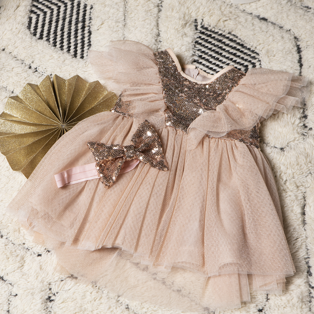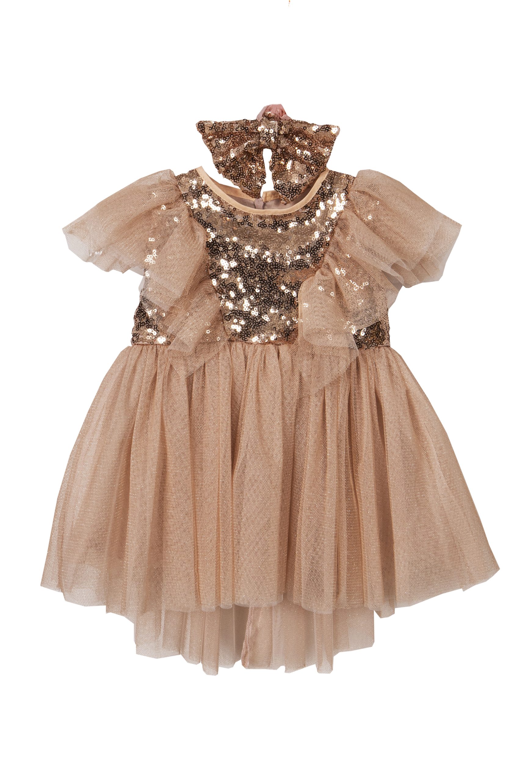 Αμάνικο φόρεμα σε σομόν χρώμα με παγιέτα και τούλι. Εσωτερική φόδρα. Κλείνει με φερμουάρ στο πίσω μέρος. Το φόρεμα παραδίδεται με κορδέλα από παγιέτα στην ίδια απόχρωση.