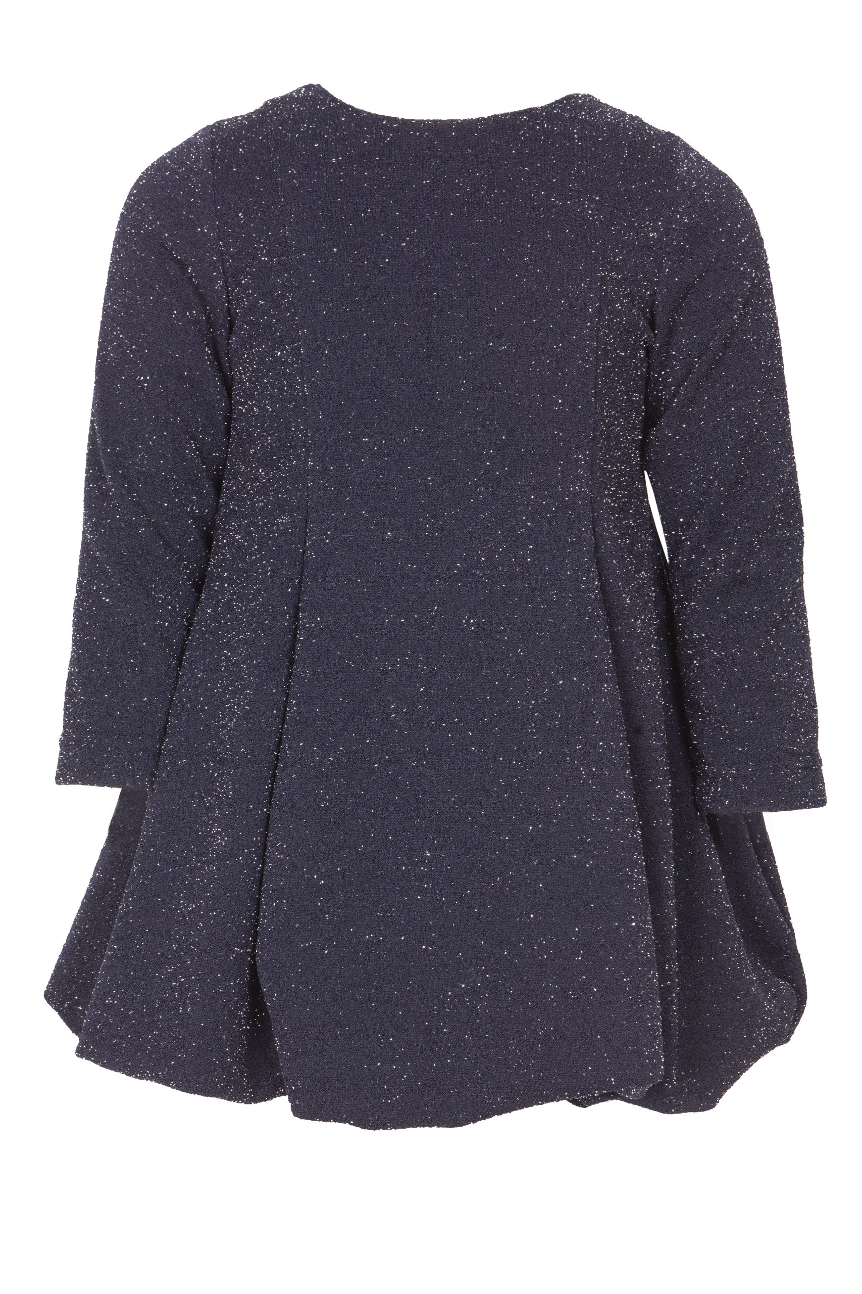 Φόρεμα με μακριά μανίκια σε μπλε σκούρα απόχρωση με ασημί κλωστή. Α γραμμή με λάστιχο στο τελείωμα. Κλείνει με φερμουάρ στο πίσω μέρος.