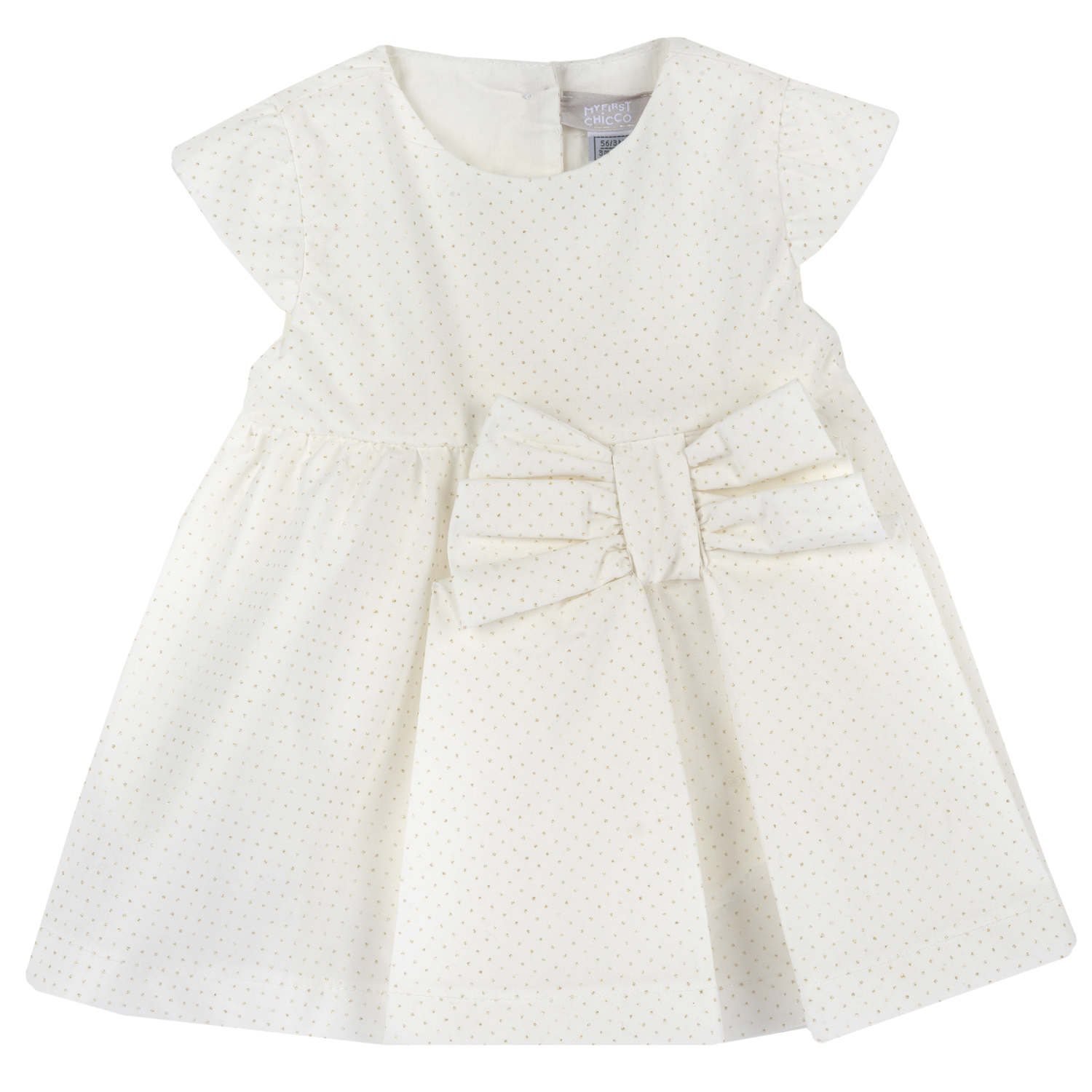 100% βαμβακερό βρεφικό κοντομάνικο φόρεμα σε εκρού χρώμα με χρυσά πουά. Εσωτερική φόδρα. Κλείνει με κουμπιά στο πίσω μέρος.