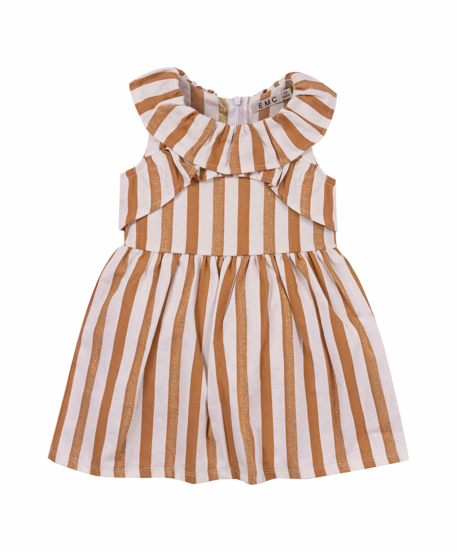 Παιδικό βαμβακερό φόρεμα ριγέ σε μπεζ/ταμπά αποχρώσεις με χρυσή κλωστή. Βολάν στη λαιμόκοψη, Κλείνει με φερμουάρ.