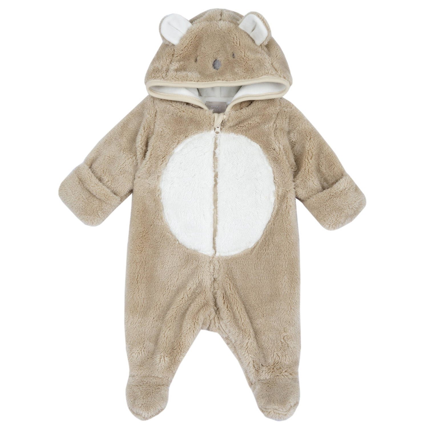Μαλακή φόρμα εξόδου με χνουδωτή υφή. Σε καφέ χρώμα με λευκές λεπτομέρειες και φερμουάρ μπροστά. Τα μανίκια στο κάτω μέρος έχουν άνοιγμα για επιπλέον διευκόλυνση το οποίο δεν αφαιρείται. Η φόρμα έχει μοτίβο αρκούδα με αυτάκια στην κουκούλα.